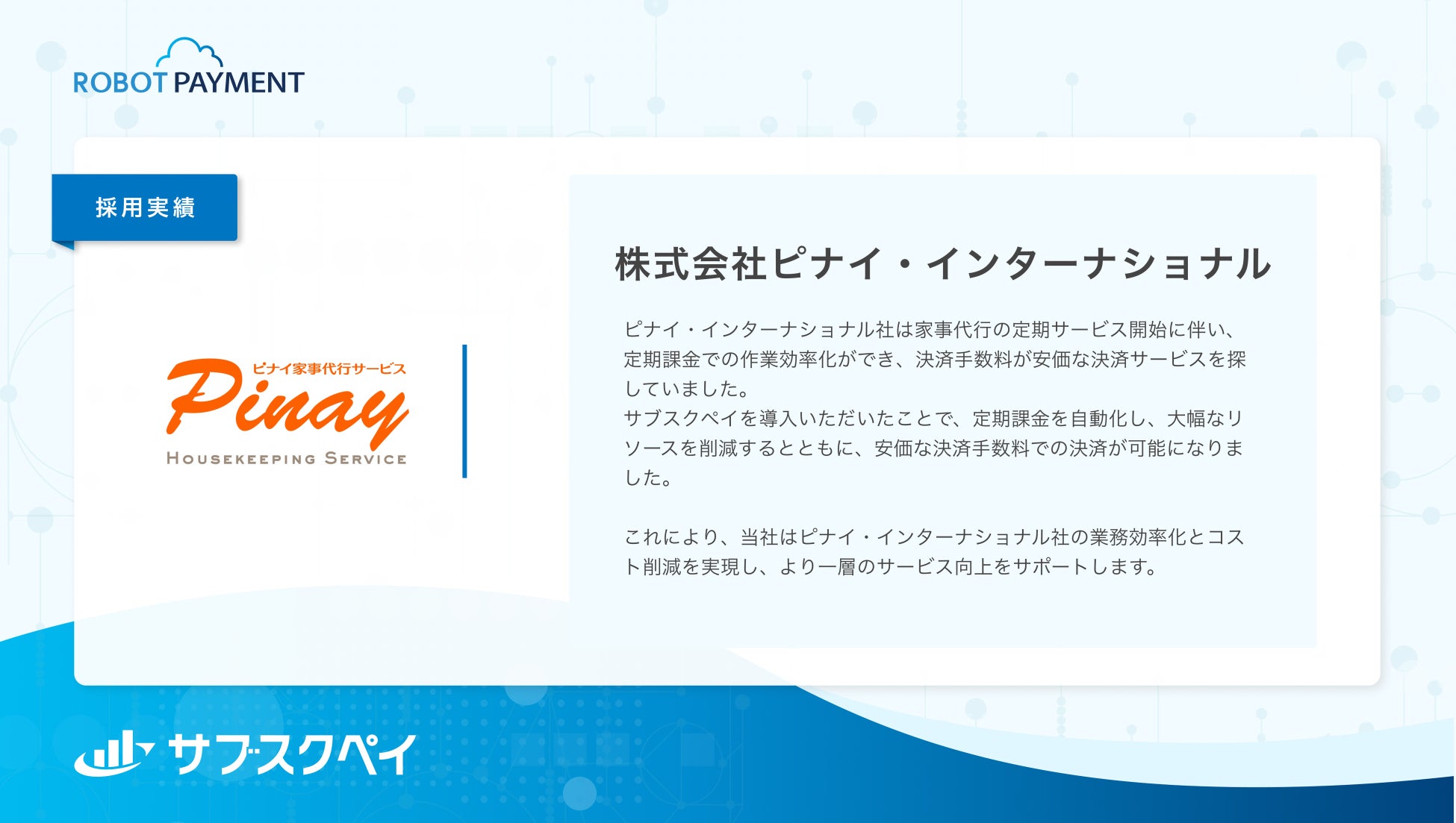 ピナイ・インターナショナル社は家事代行の定期サービスを提供しており、クレジットカード決済での定期課金を効率化でき、決済手数料が安価な決済サービスを探していました。