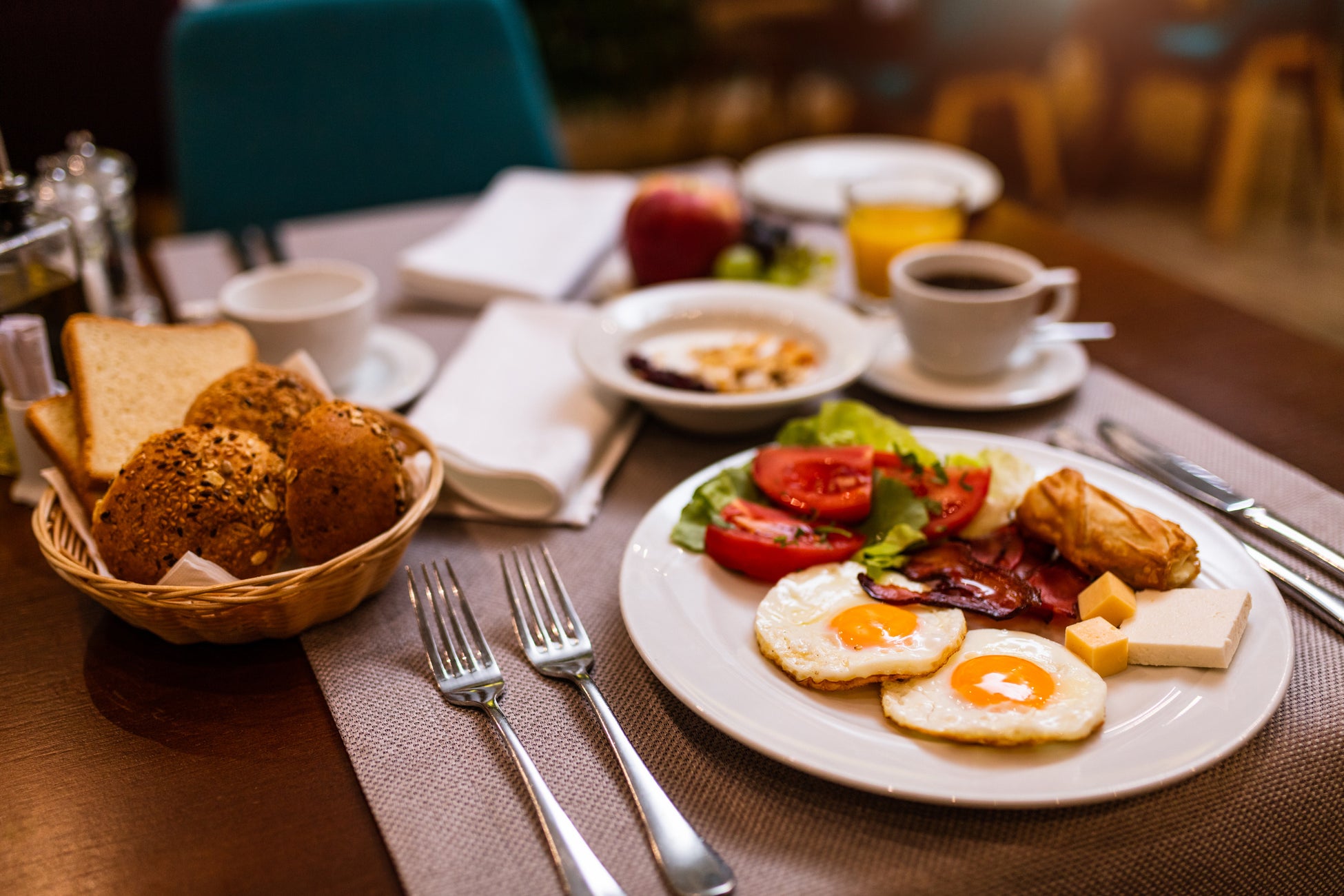 3種のメイン料理からお選びいただくプレートにビュッフェがついた朝食をご用意しています。