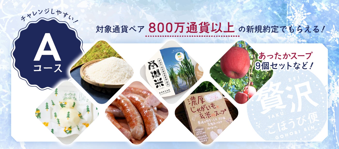 キャンペーン期間中に、米ドル/円(USD/JPY)およびロシアルーブル/円(RUB/JPY)を除く、当社が取り扱う32通貨ペアにおいて、合計800万通貨以上の新規約定取引をされたお客さま全員に、日本各地の“こだわりの逸品”をプレゼントいたします。