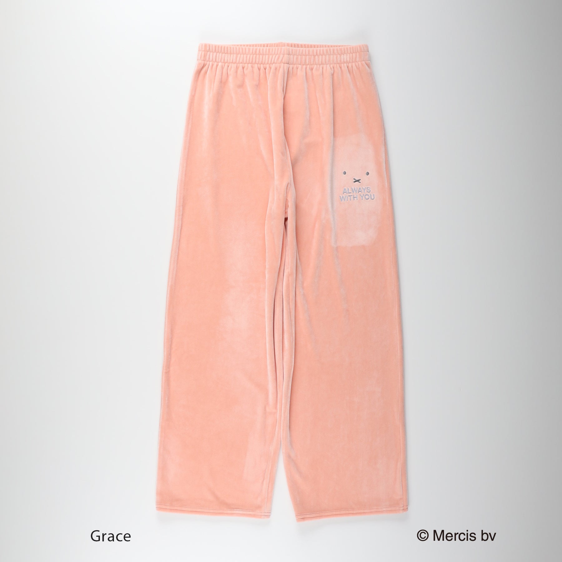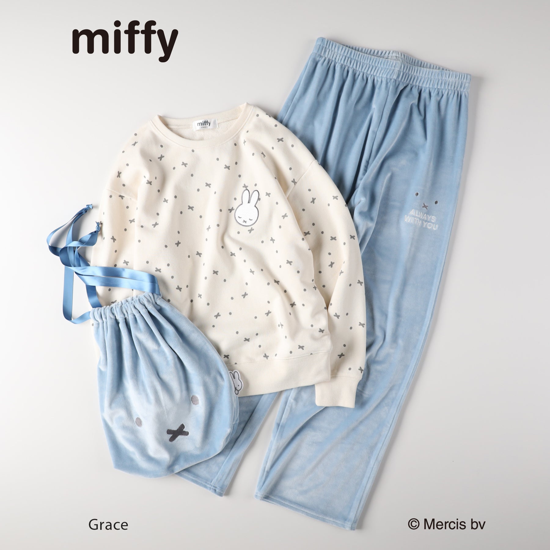 トップスは、ミッフィーの目と口のモチーフを総柄で施し、胸元には目を閉じたミッフィーの刺繍で、遊び心のあるデザインに仕上げました。ボトムや巾着にもミッフィーの顔が施されており、カラーは全2色展開です。旅行時の携帯や普段の収納にも便利です。