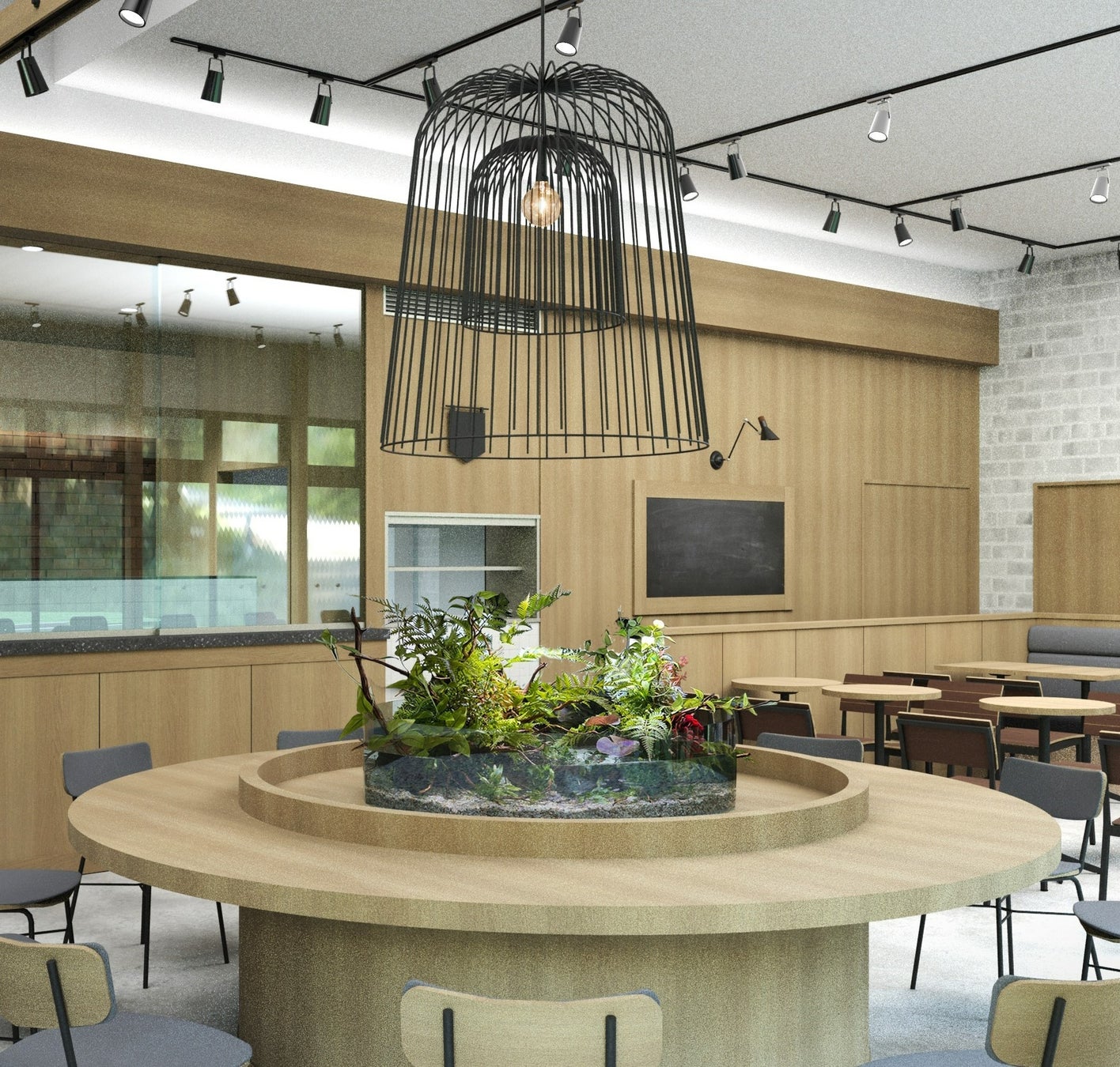 店舗のインテリアは自然な素材感で構成し、天井や壁材には環境配慮素材のリサイクルタイルを使用。客席の大テーブルには水槽ビオトープ(自然生態系を再現したアクアリウム)を設け、水に揺らめく生物や植物を眺めながら、ドトール パークカフェのテーマでもある「人と生物と自然の共存」を感じていただける演出を行います。