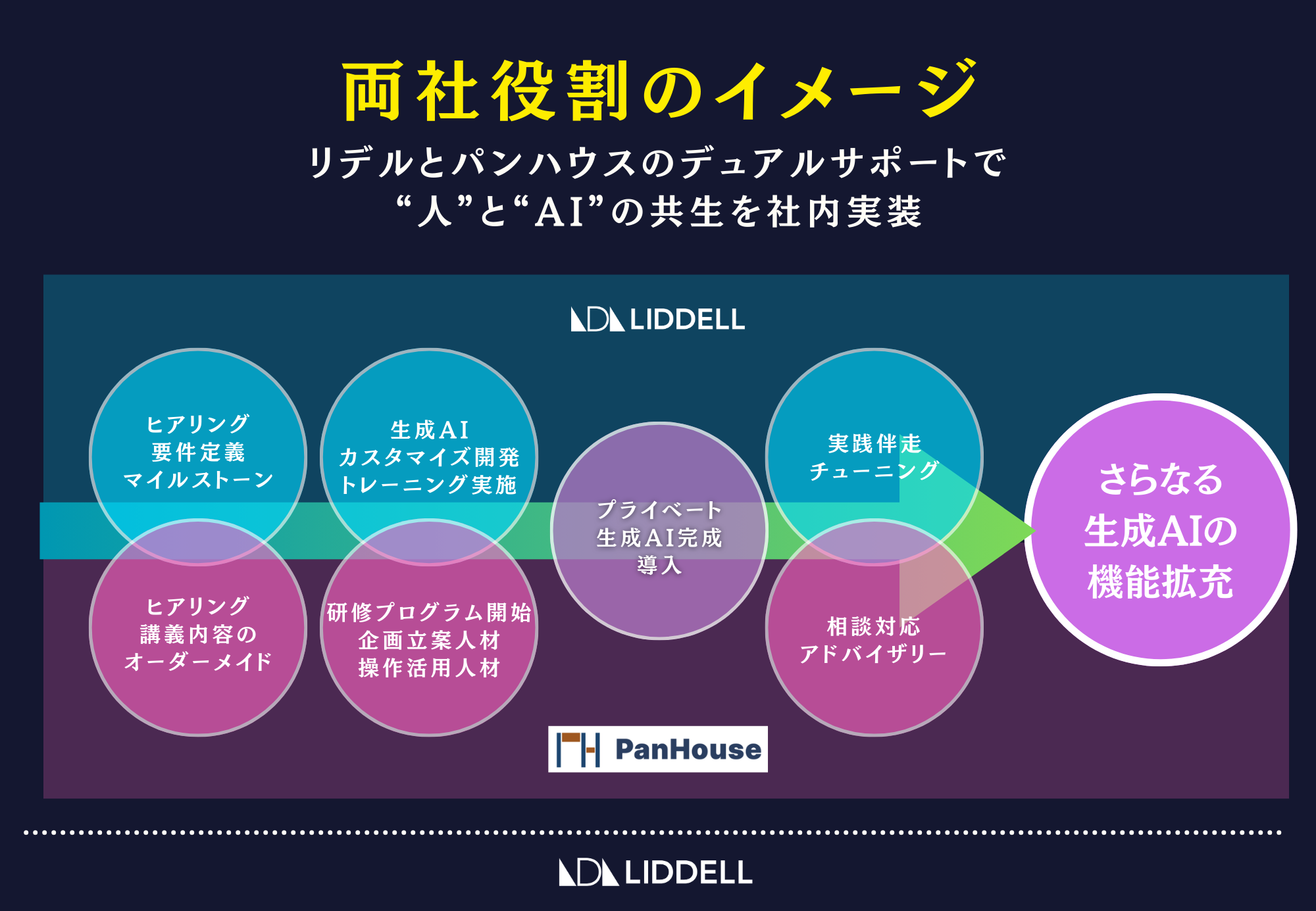 リデルはパンハウスと協業し「AI開発&導入」と「AI研修&活用」を組み合わせた「AIX推進支援パッケージ」の提供を開始。ChatGPTを含むプライベート生成AIを実践的に社内実装します。