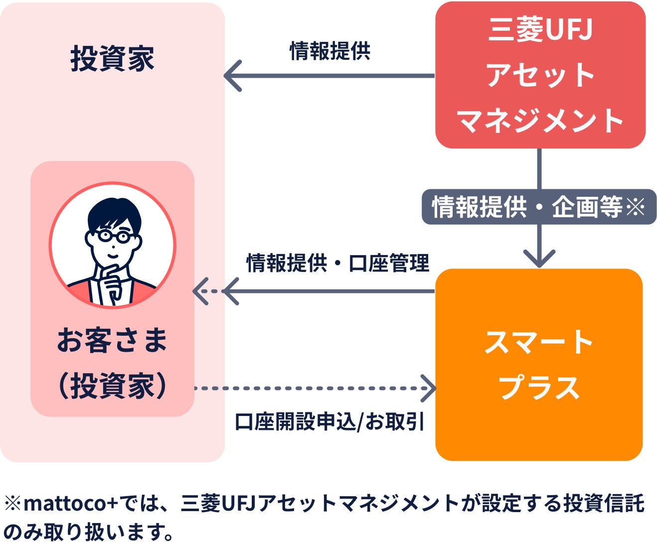 三菱 UFJ アセットマネジメントは、同社が発信するファンドに関する情報等の提供、および同社のファンドや「mattoco+」に関するセミナーの開催などを担います。当社は「mattoco+」におけるお客さまの口座の管理や設定解約代金の受渡、法定書面等の交付等および、これらに関する情報提供やお問い合わせ対応などのサービス提供を担います。