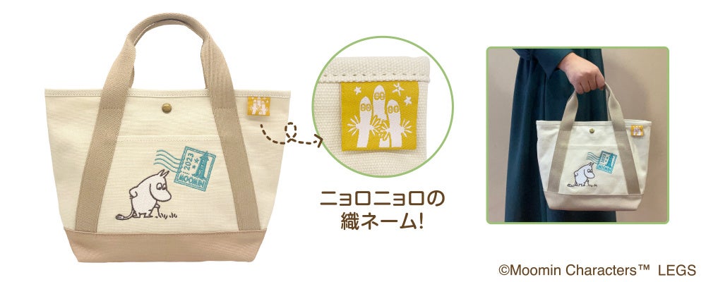 前ポケットにムーミンが刺繍されたトートバッグは、ベージュでシンプルな色合いの中に、黄色いニョロニョロの織ネームがアクセントになっていておしゃれ!普段使いにちょうどいいランチトートサイズです。