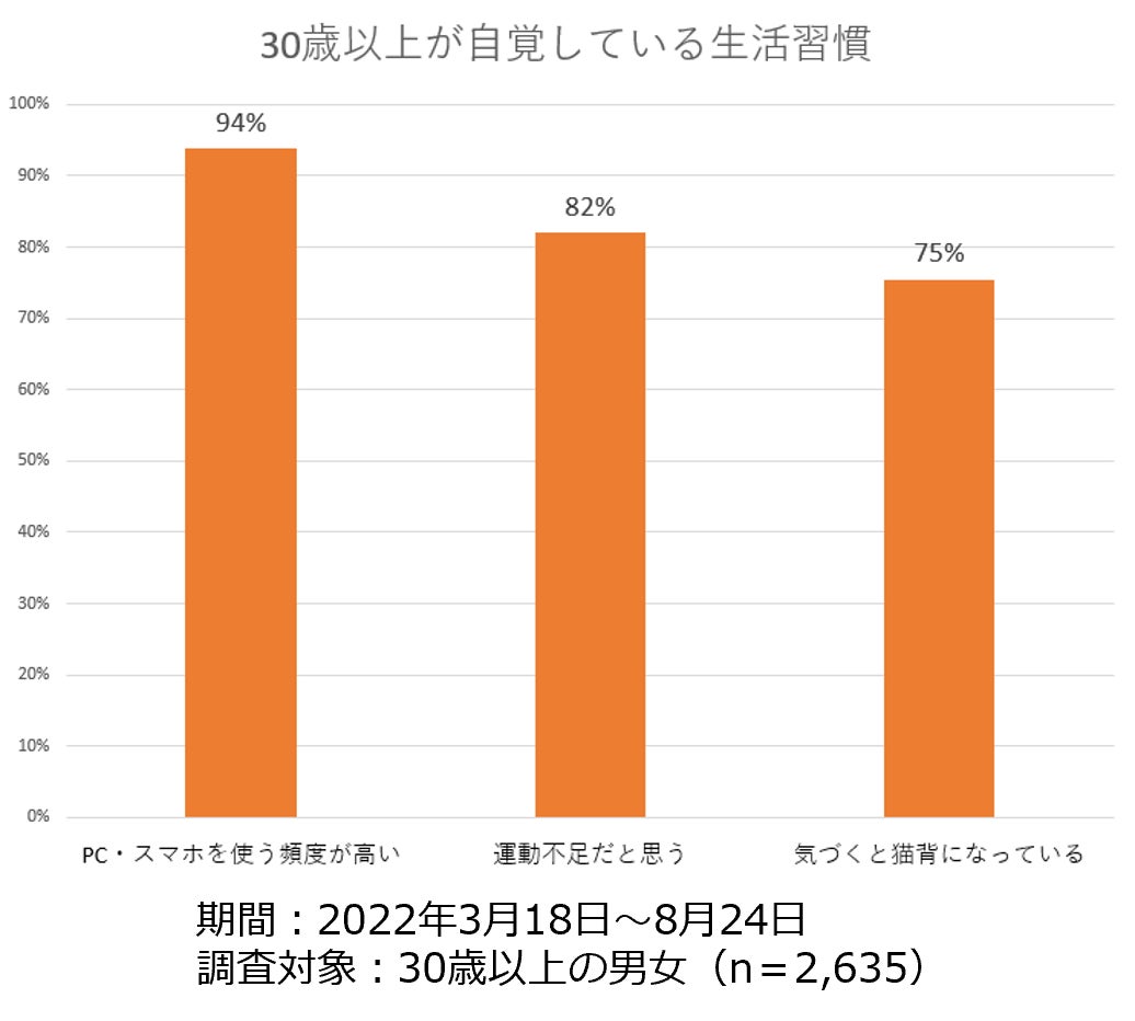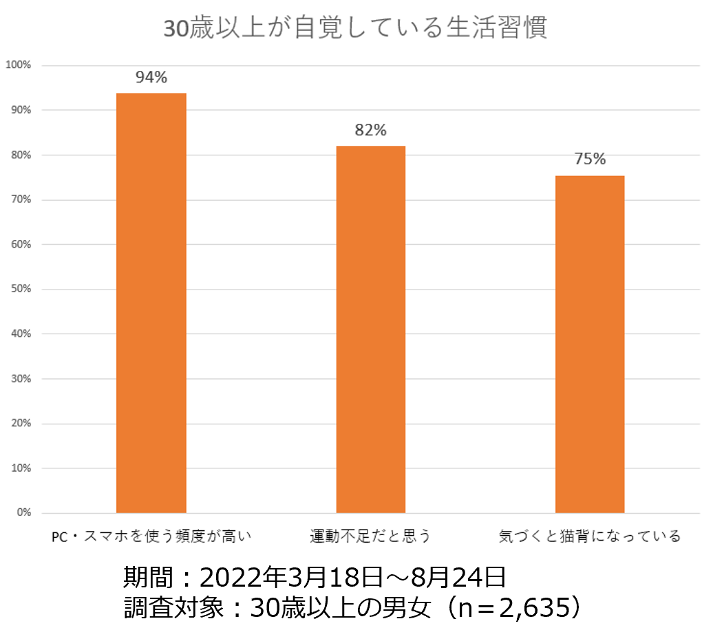 『ドクターエア』では、ライフスタイル別に体の疲労箇所をチェックできるコンテンツ「ドクターエア健康チェック」を実施しております。そのアンケートでは、30歳以上の男女2,635人が自覚度の高い生活習慣の1位は「PC・スマホの使用頻度が高い」、2位は「運動不足」があげられる結果に!コロナ禍を経て、使用時間の増えてきたモバイル機器の使用時間や、在宅ワークやリモート形式でのミーティングの一般化などによって、1日の活動(運動)量が減ってしまった影響による生活習慣の悪化を感じる人が多いと推測できる結果となりました。