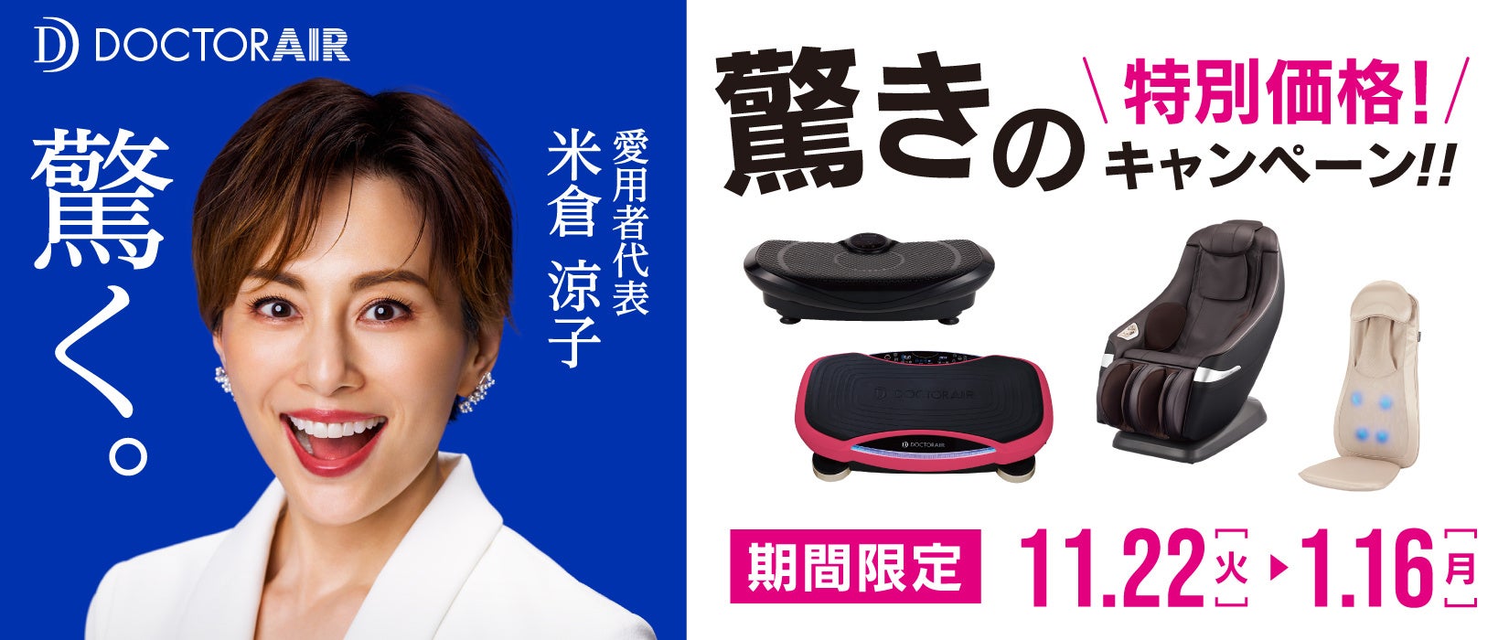 全国約4,000店で取り扱われているトータルボディケアブランド『ドクターエア』では、大人気のマッサージ器とフィットネスマシンを特別価格でご提供する「ドクターエア “驚き”の最大20,000円OFFキャンペーン」を、2022年11月22日(火)~2023年1月16日(月)の期間限定で全国のドクターエア製品取扱店にて実施いたします。