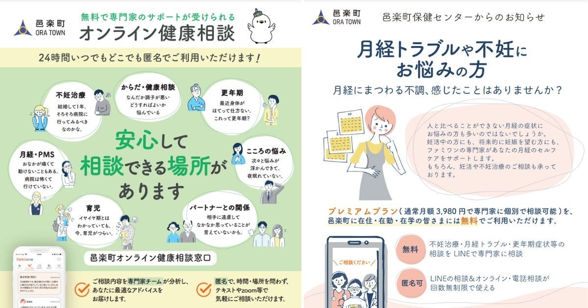 ファミワンは邑楽町より委託をうけ、「オンライン健康相談事業」として専門家によるヘルスケアサポートの提供を2021年より行なっています。妊活・不妊治療についてだけではなく、からだやこころなど健康について幅広い相談に無料で対応しておりますので、ぜひお気軽にご登録ください。