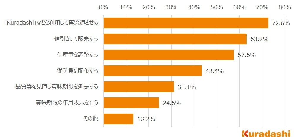 フードロス削減に対する取り組みとして最も多かった回答は「『Kuradashi』などを利用して再流通させる」で72.6%
