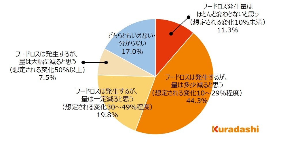 「フードロスは発生するが、量は多少減ると思う(想定される変化10~29%程度)」と回答した方が最も多く44.3%でした。また、「フードロス発生量はほとんど変わらないと思う(想定される変化10%未満)」という回答が11.3%だったことから、半数以上にあたる約55%の方がフードロス発生量の想定される変化は29%以下に留まるのではないかと回答しています。