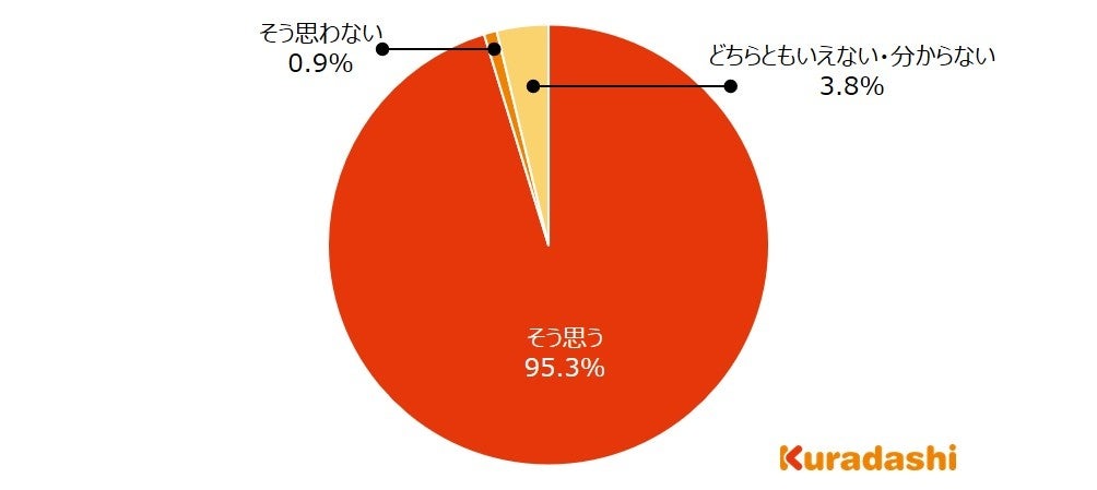 「そう思う」と回答した方が95.3%で、食品関連事業者において「Kuradashi」のようなフードロスになってしまいそうな商品を再流通させるサービスの有用性が広く認知されていると言えます。