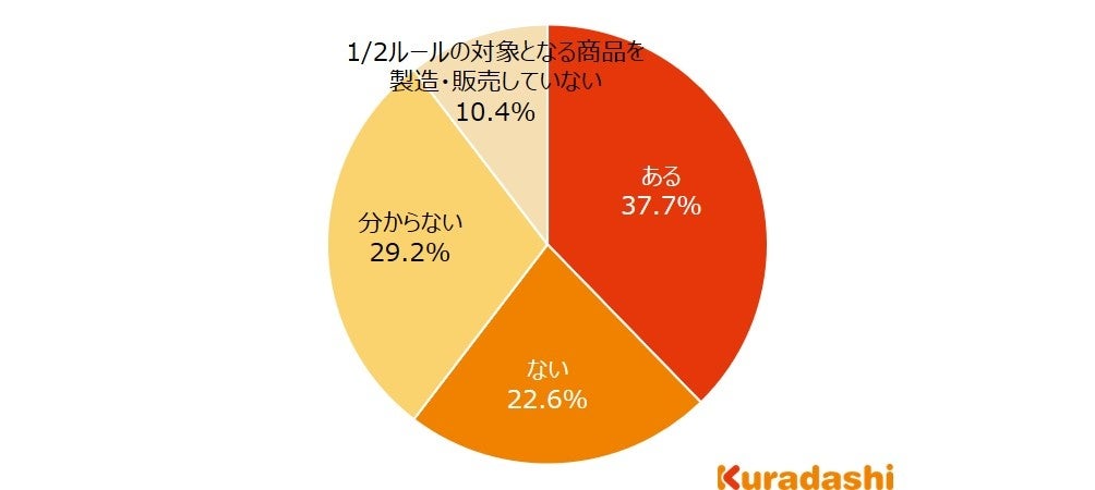 「ない」「分からない」「1/2ルールの対象となる商品を製造・販売していない」と回答した方が62.3%であることから、「まだ1/2ルールでの納品は広く実施されているとは言えない」という状況が読み取れます。