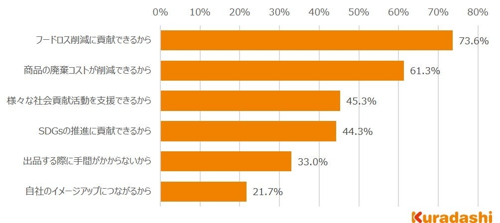「Kuradashi」へ出品する理由として最も多かった回答は「フードロス削減に貢献できるから」で73.6%、次いで「商品の廃棄コストが削減できるから」で61.3%でした。