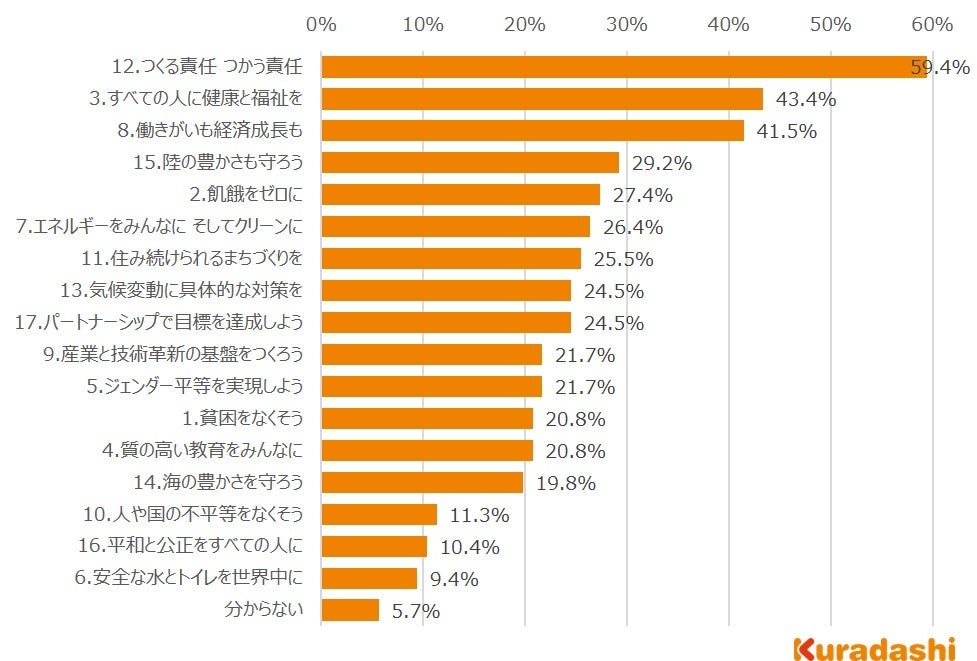 「12.つくる責任 つかう責任」が最も多く59.4%、次いで「3.すべての人に健康と福祉を」が43.4%という結果となりました。食品関連事業者にとって「12.つくる責任 つかう責任」は、フードロス削減や商品パッケージのリサイクル等、関連する内容が多いことから、最も取り組まれていると推察されます。