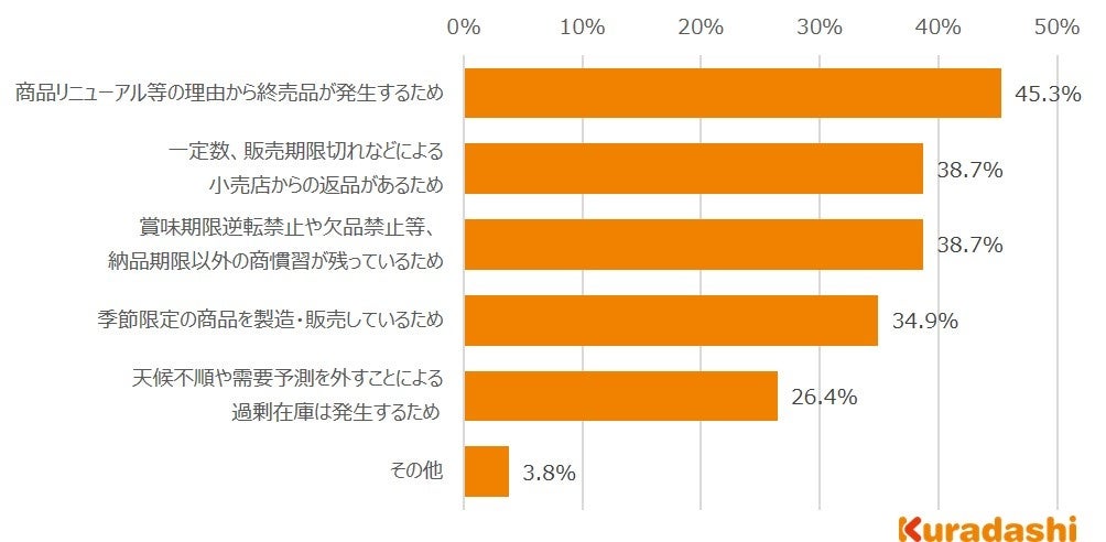 最も多かった回答は「商品リニューアル等の理由から終売品が発生するため」で45.3%でした。次いで「一定数、販売期限切れなどによる小売店からの返品があるため」、「賞味期限逆転禁止や欠品禁止等、納品期限以外の商慣習が残っているため」がそれぞれ38.7%という結果となりました。