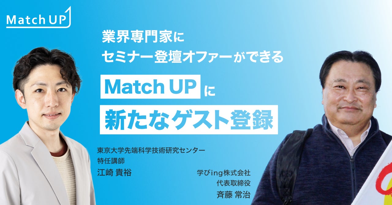 業界専門家にセミナー/イベント登壇のオファーができる「Match UP」東京大学先端科学技術研究センター 江崎 貴裕氏、学びing株式会社 斉藤 常治氏などが新たにゲスト登録!