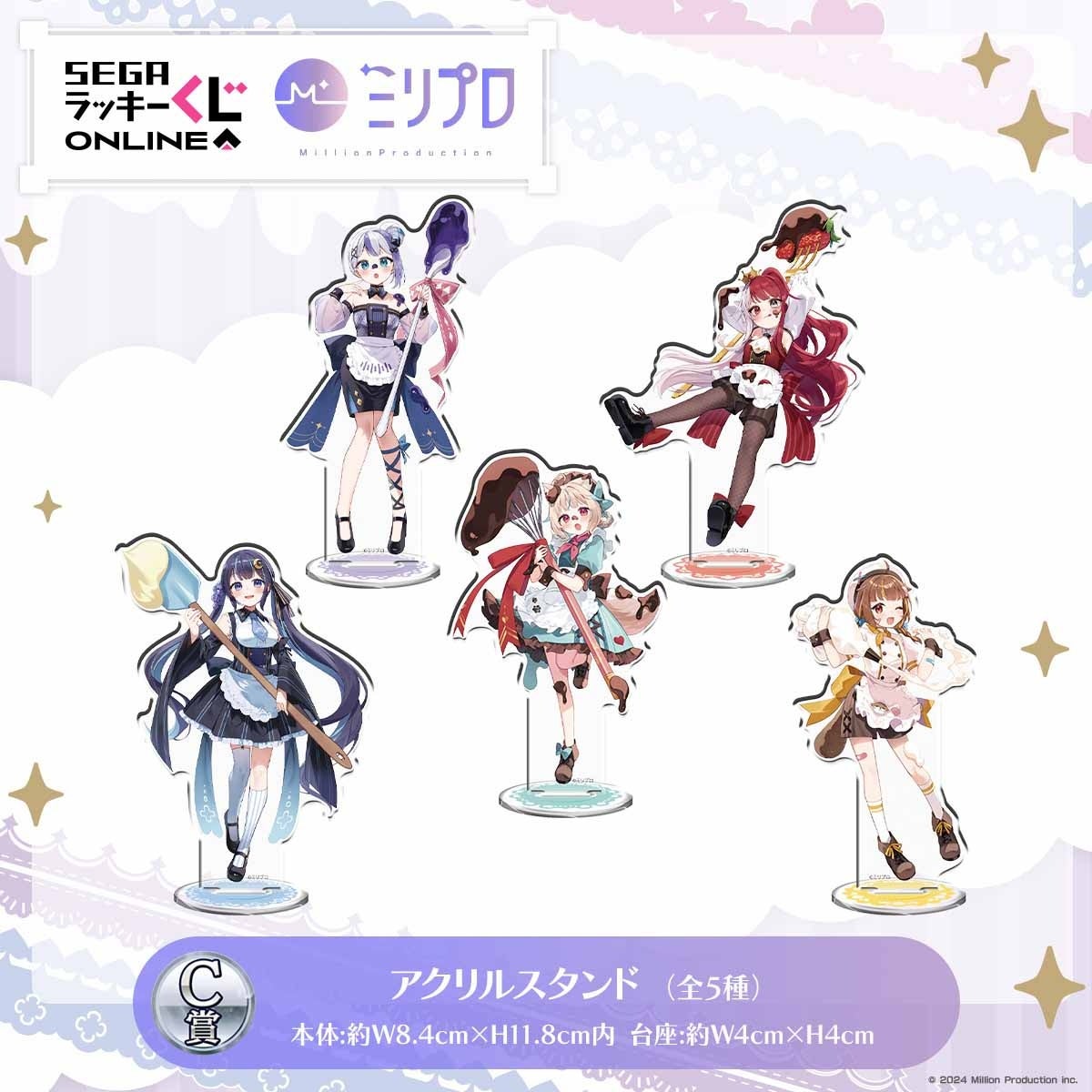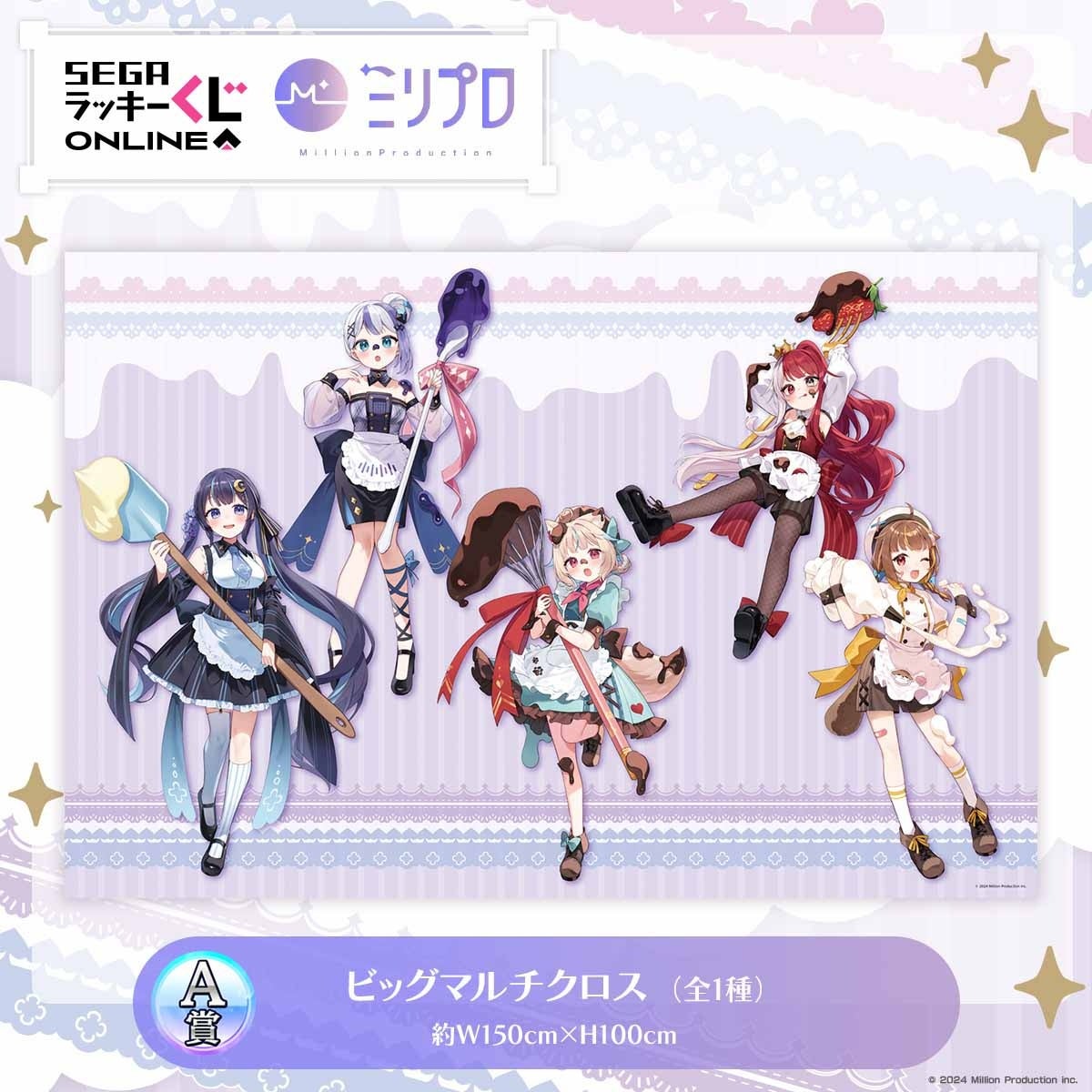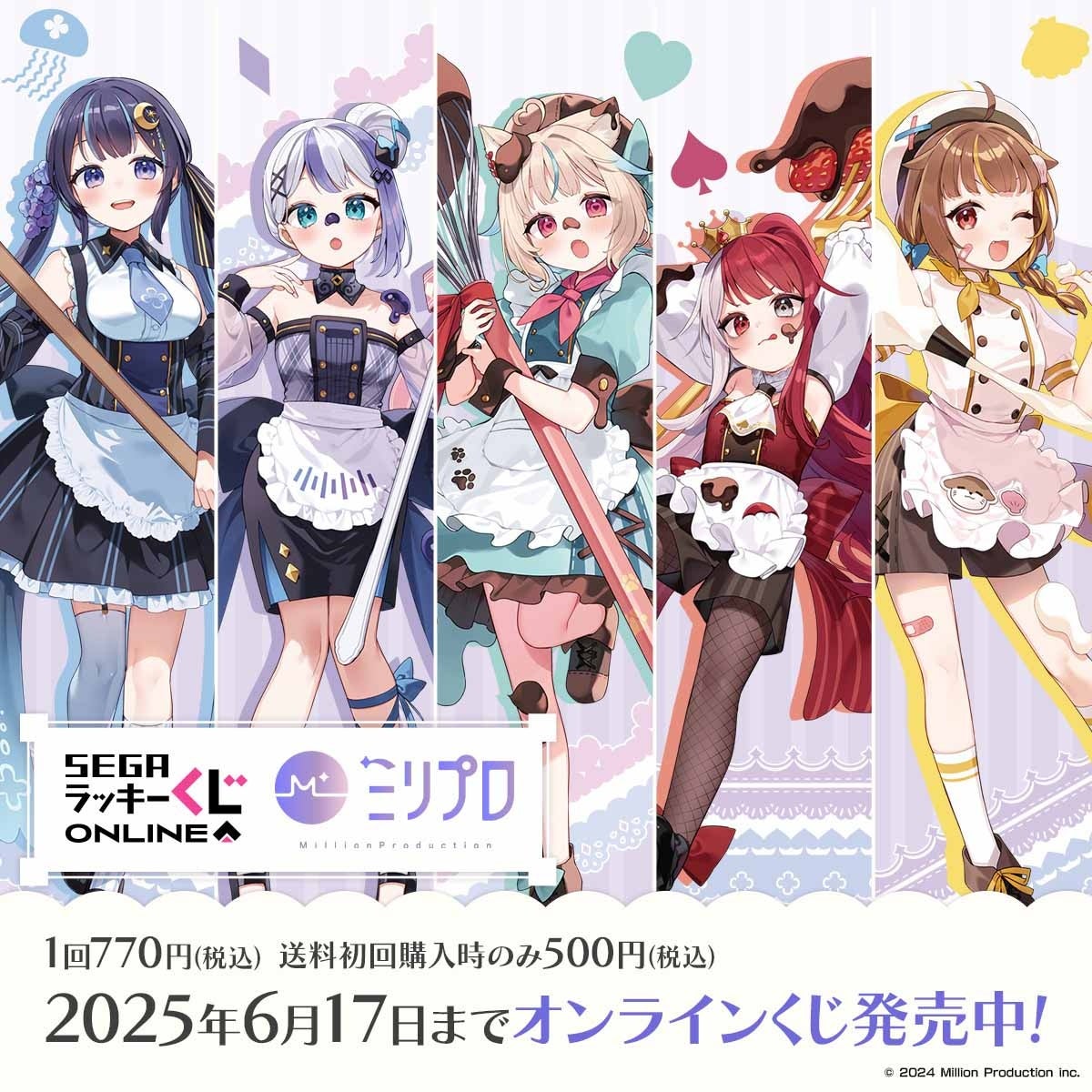 当くじは、スイーツを作っている「ミリプロ」タレントたちをテーマにしたセガ限定オンラインくじです。このくじのために、エプロンすがたでホイップクリームやチョコレートまみれになったミリプロタレントたちの描きおろしイラストをご用意いたしました。