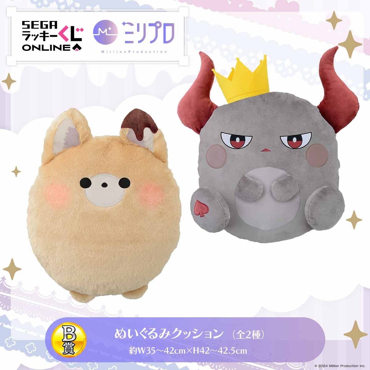 描きおろしイラストを堪能できるA賞「ビッグマルチクロス」やC賞「アクリルスタンド」、「もふまる」や「がぶ丸」をクッションにしたB賞「ぬいぐるみクッション」、タレントたちをマスコットにしたD賞「ぬいぐるみマスコット」、集めて楽しいE賞「キラキラ缶バッジ」やF賞「ステッカーセット」など充実したラインナップとなっています。
