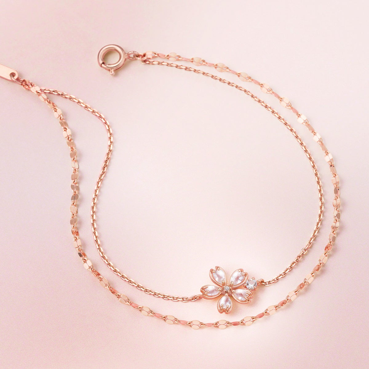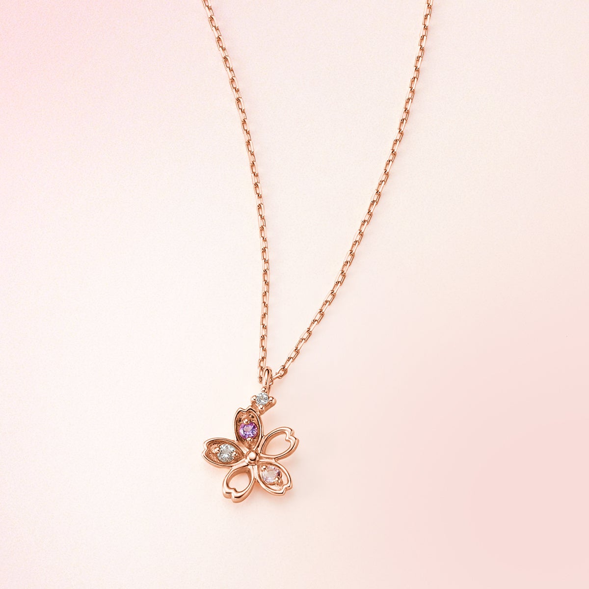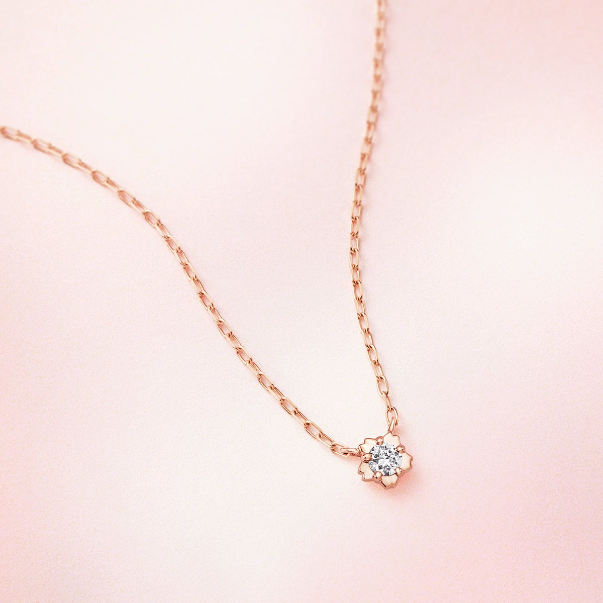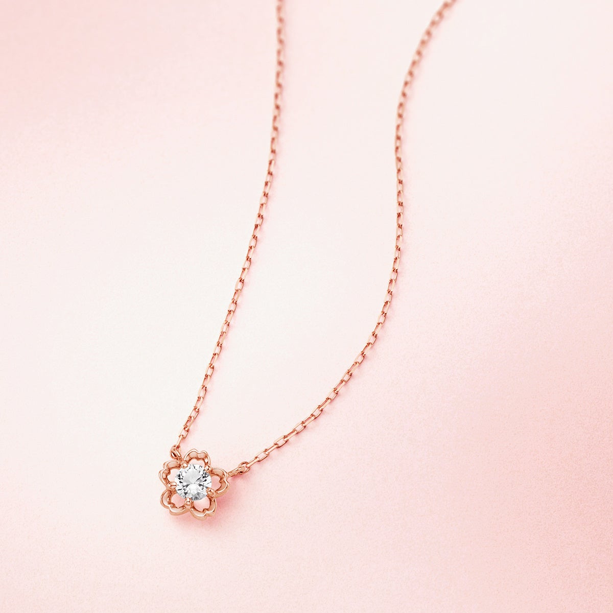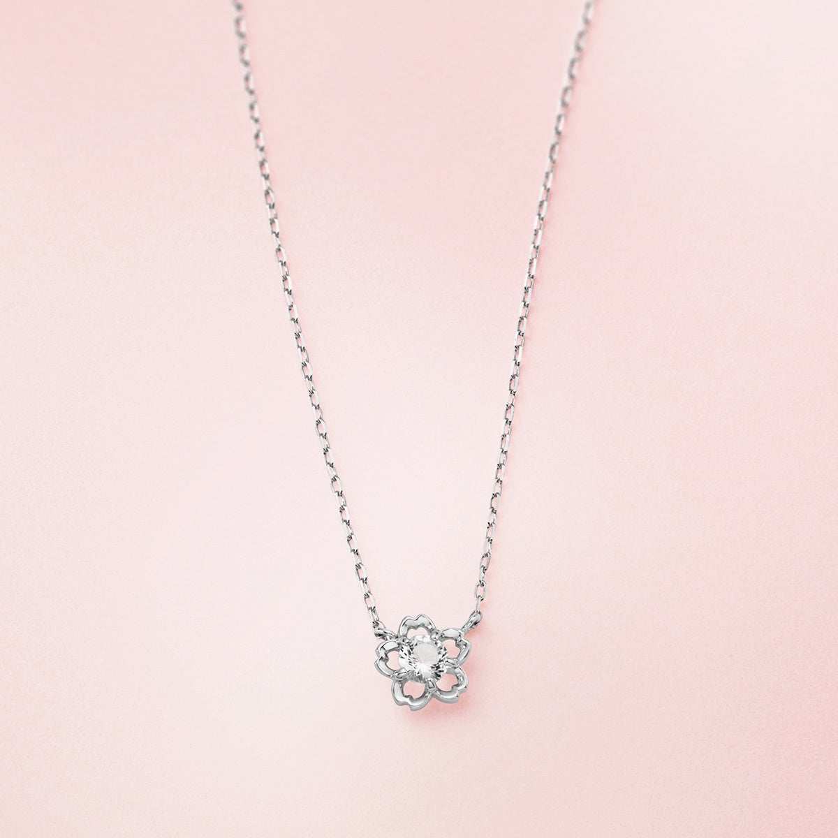 春を待つ胸の奥に、ふと花びらが舞い降りるようなEC限定商品は、やさしさと凛とした美しさを纏う、特別なネックレス。可憐に咲いた桜の花をそのまま胸元に添えるようなデザインは、繊細にカットされた花びらが、ひとつひとつ丁寧に連なり、まるで一輪の記憶を留めるように輝きます。風にのせて運ばれてくるような、ひとさじの季節の記憶を身につけて。