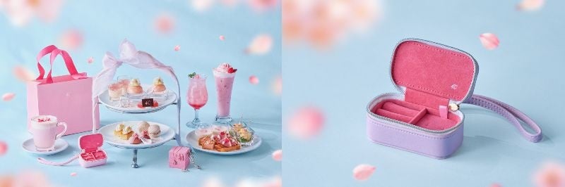 桜のジュレとマスカルポーネクリーム、桜薫る苺のムース、ライチとピンクグレープフルーツのパートドフリュイなど、透明感と煌めきを表現した珠玉のスイーツと、桜エビのタルトや桜鯛のフリットなど春らしい全4種のセイボリー。 紅茶・コーヒーなど約16種類のドリンクフリーフローが付き、予約者には数量限定の「オリジナルジュエリーケース」をプレゼント。