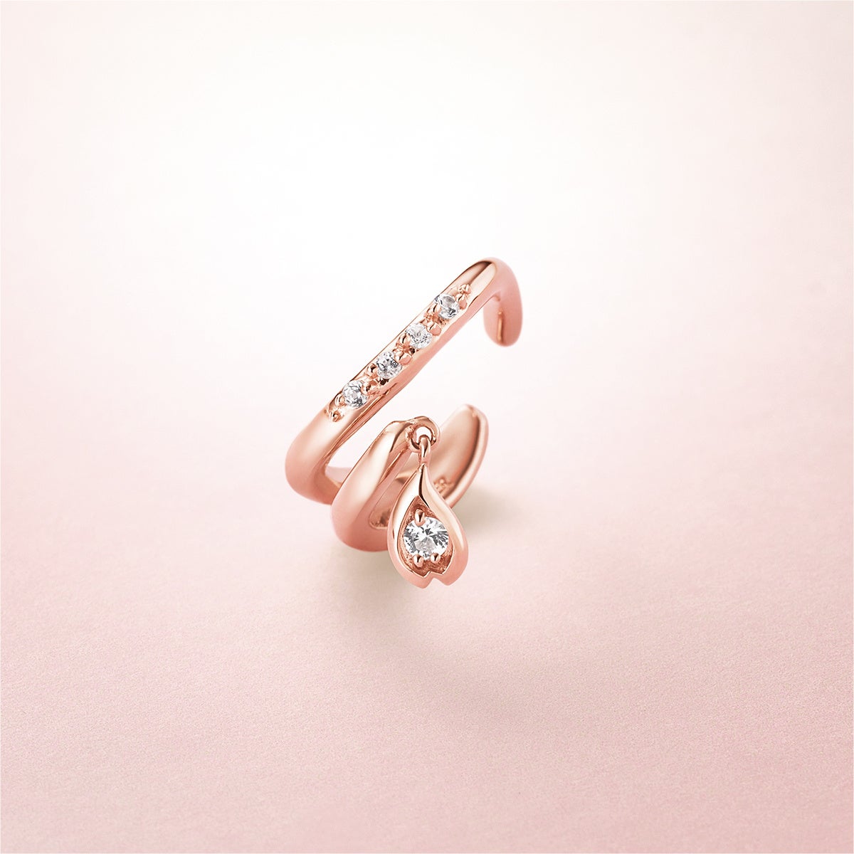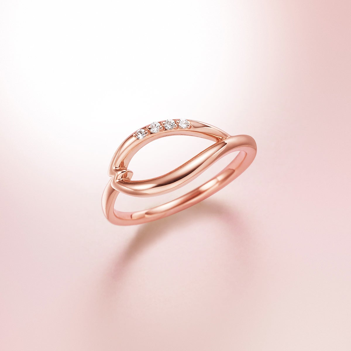 桜の花びらをモチーフに、春の情景を繊細に表現したリングとピアスとイヤリング。桜のフォルムには、石の内側から光を集め、やわらかな輝きを生み出す4℃オリジナルのコンケープカットを採用。ふんわりと咲き誇る桜の表情を表現しました。リングは、桜の花びらが指元で咲く立体的なデザインで、一点でも華やかな存在感を演出。ピアスとイヤリングは、花びらを連ねた緩やかなカーブが特徴で、揺れるたびに光を受け、舞い落ちる桜のような軽やかな表情を添えます。移ろう春の美しさを閉じ込めた、特別なジュエリーです。