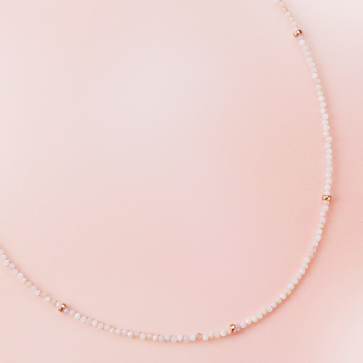 夜の帳が静かに降りてくるように、落ち着いたトーンが胸元を包み込む、店舗限定のピンクオパールビーズのネックレス。淡いピンクのオパールに、桜の花びらのカットを忍ばせた繊細なディテールが、密やかに咲く春の息吹を感じさせます。ビーズの連なりは、まるで静かに降る夜桜のよう。角度によってほんのりと艶めくその表情は、日常の装いにさりげない彩りと凛とした気品を添えます。このネックレスは、身に着ける人の内にあるやさしさを、そっと映し出してくれる存在です。