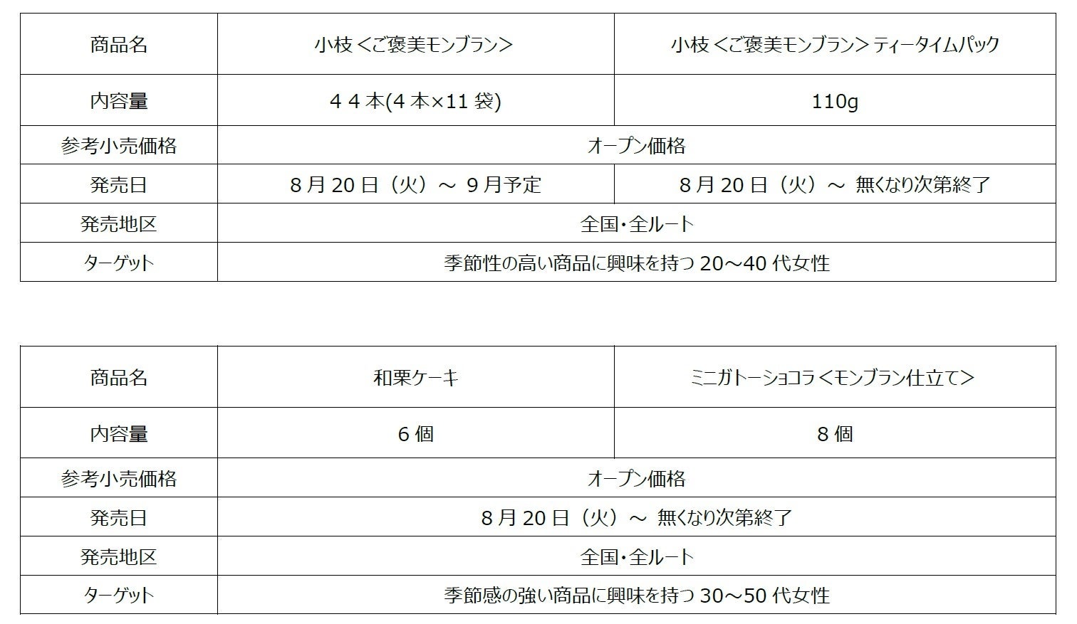 森永製菓株式会社(東京都港区芝浦、代表取締役社長・太田 栄二郎)は、秋の味わいを楽しめる「小枝<ご褒美モンブラン>」、「ミニガトーショコラ<モンブラン仕立て>」、「和栗ケーキ」を8月20日(火)より発売いたします。