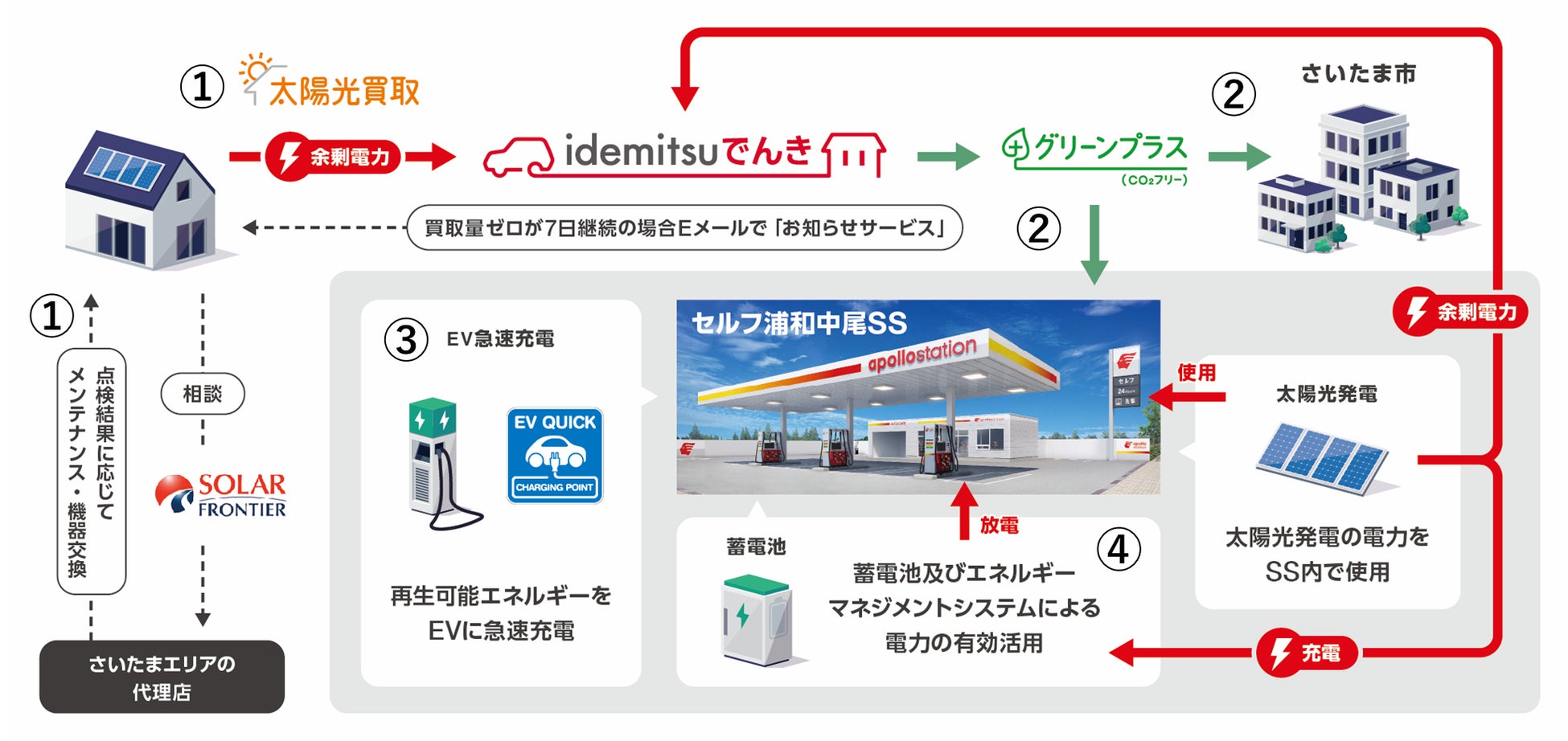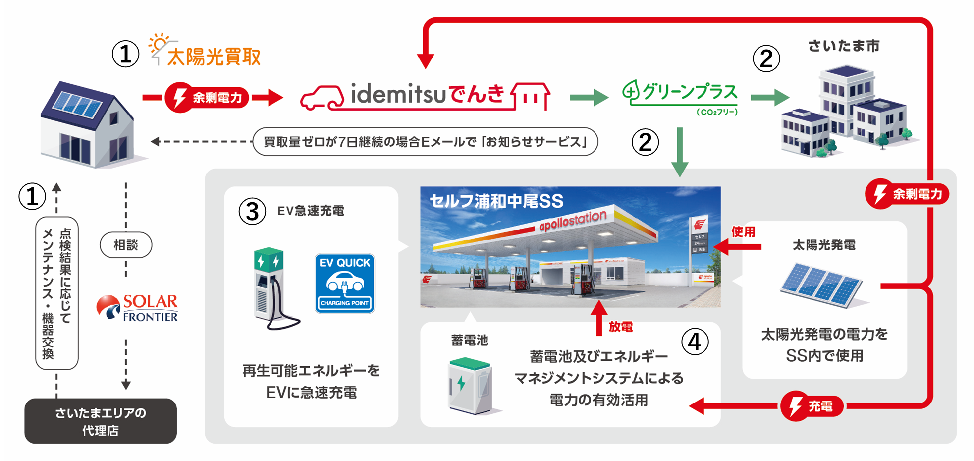 ②買い取った太陽光の余剰電力を、idemitsuでんきの再生可能エネルギー電力「グリーンプラス(CO2フリー)」※2として、さいたま市の公共施設、セルフ浦和中尾SSに供給しています。