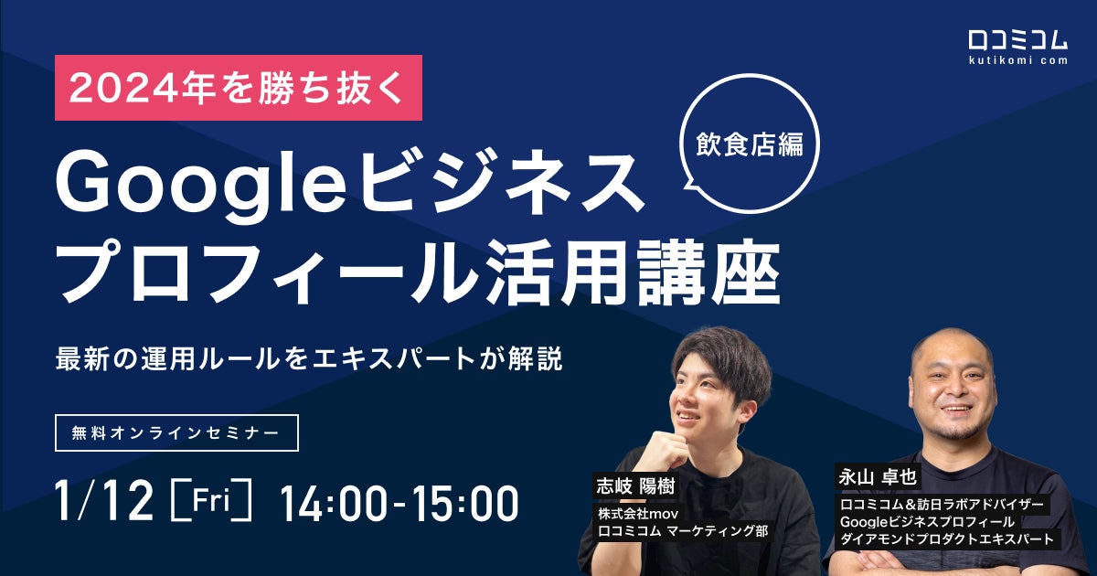 口コミサイトを”もっと”売上に変える、AI店舗支援SaaS「口コミコム」を運営する株式会社mov(代表取締役:渡邊 誠、本社:東京都渋谷区、以下mov)は、1月12日(金)14:00〜15:00よりオンラインでセミナーを開催します。参加費は無料です。