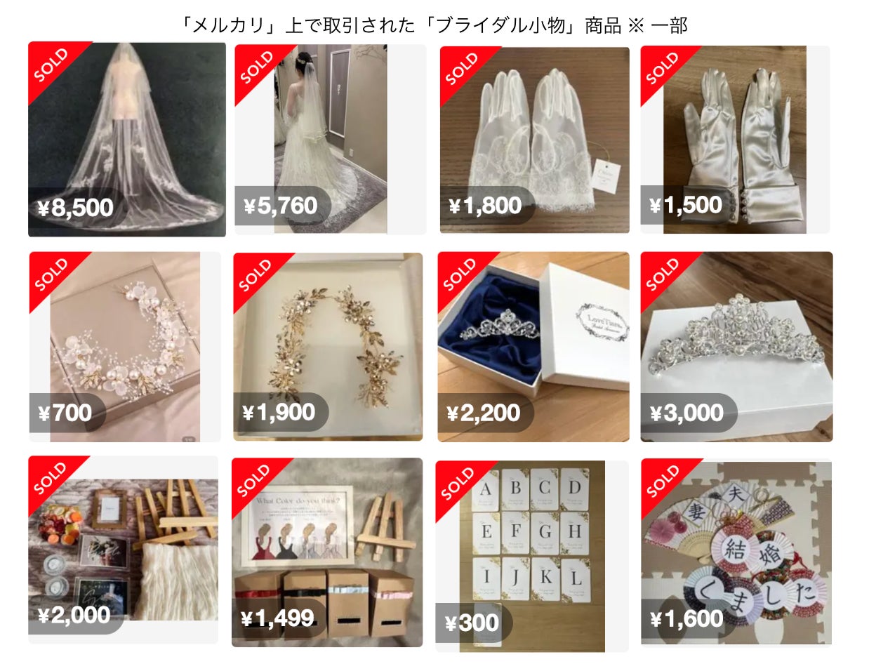 「その他」には、結婚式場のウェルカムスペースを彩る装飾品のセットや、テーブルナンバー、お色直しドレス当てクイズのセット、前撮り撮影用のプロップスなど、様々なアイテムが含まれています。また、自身の結婚式のために手作りした小物を、準備に追われる次の花嫁のために「メルカリ」で出品するケースも多く見られ、「ブライダル小物」も『幸せバトン』として受け継がれていく流れが生まれています。