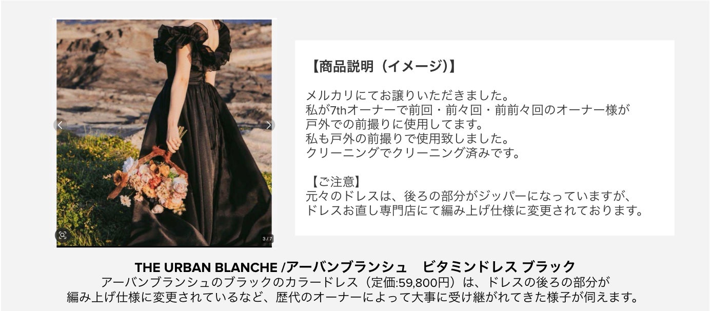 主に、自ら着用したウェディングドレスを、次の花嫁へ譲ることを、「メルカリ」では『幸せバトン』として根付きつつあります。実際に調査した中では、8人目の花嫁を探す“7人目のオーナー”による「アーバンブランシュ」のカラードレスの出品が確認されました。
