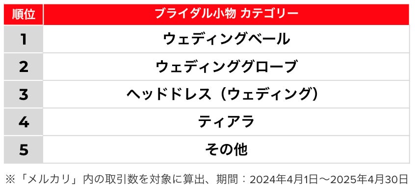 2024年4月1日〜2025年4月30日の期間に、「ウェディング」をキーワードに含む商品の中から、取引件数が多かった「ブライダル小物」カテゴリーを調査しました。その結果、1位「ウェディングベール」、2位「ウェディンググローブ」、3位「ヘッドドレス(ウェディング)」、4位「ティアラ」、5位「その他」となりました。