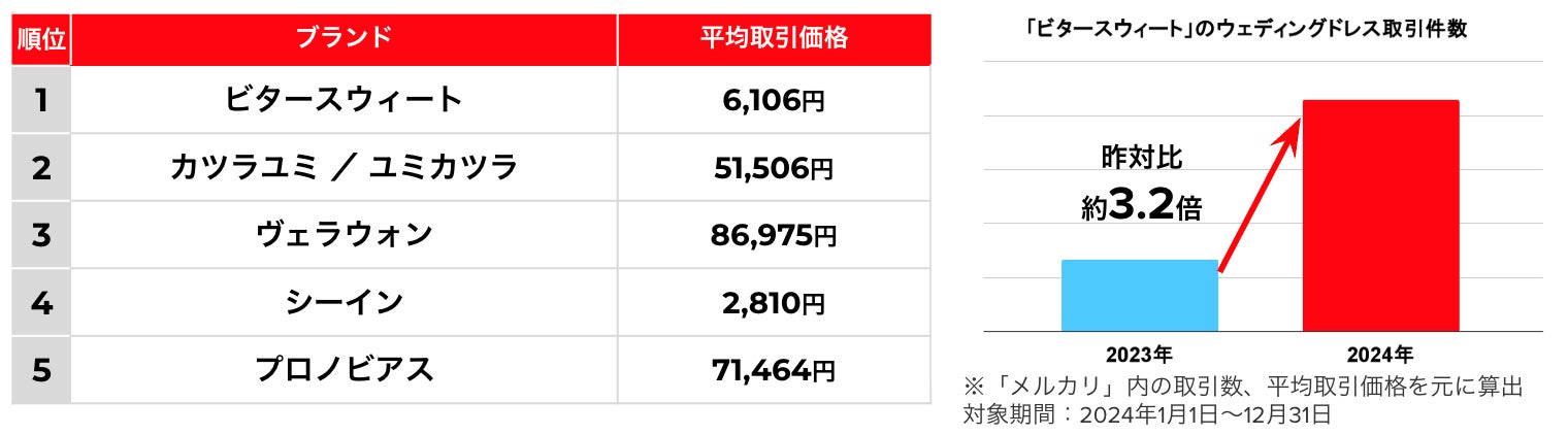 2024年に「メルカリ」で取引されたウェディングドレスの人気ブランドを調べたところ、1位は「ビタースウィート」(平均取引価格:6,106円)、2位は「カツラユミ/ユミカツラ」(平均取引価格:51,506円)、3位は「ヴェラウォン」(平均取引価格:86,975円)、4位は「シーイン」(平均取引価格:2,810円)、5位は「プロノビアス」(平均取引価格:71,464円)となりました。特に、1位となった「ビタースウィート」は、取引件数が昨対比で約3.2倍と大きく増加。4位の「シーイン」とあわせて、手頃な価格帯のブランドの人気が高まっている傾向がわかりました。