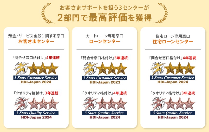 「問合せ窓口格付け」部門では、カードローン専門窓口の「ローンセンター」が5年連続、預金・サービス全般の窓口である「お客さまセンター」と住宅ローン専門窓口の「住宅ローンセンター」が4年連続で三つ星を獲得しました。また「クオリティ格付け」部門では、「ローンセンター」が4年連続、「お客さまセンター」と「住宅ローンセンター」が3年連続で三つ星を獲得しました。