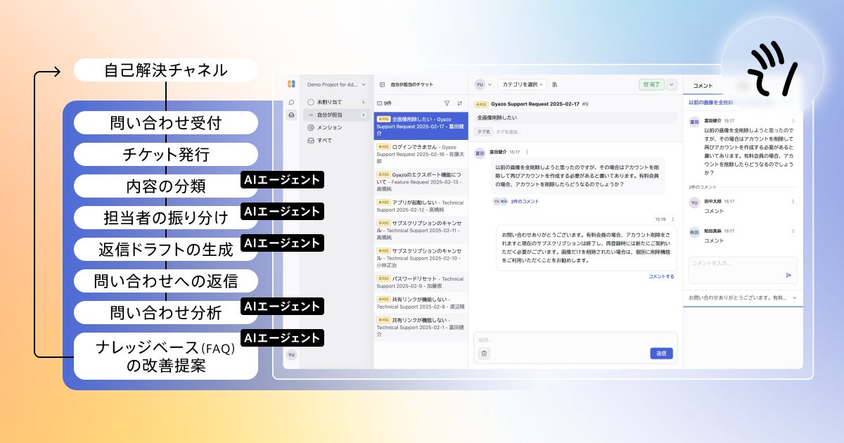 AIエージェントが問い合わせ内容を解析し、カテゴリ分類や担当者の振り分け、過去の対応履歴やFAQを参照して返信文面を自動生成します。