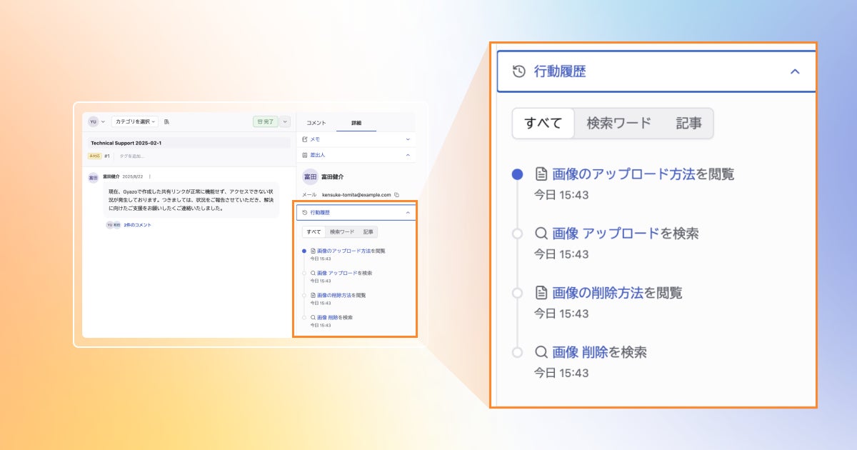 管理画面上で、問い合わせフォームやFAQの閲覧履歴を確認できます。どのFAQを参照したうえで問い合わせに至ったのかを把握できるため、顧客の状況や理解度を踏まえた最適な回答を行うことができます。
