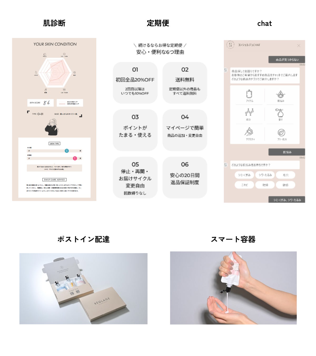 「急にスキンケアが合わなくなった」「何が自分に合っているのかわからない」など変化し続ける肌でスキンケア難民に陥りがちな方にも安心してご利用いただけるよう『肌質や好みで選べる豊富なラインナップ』と、『肌状態からベスト処方をご提案する肌診断機能』をご用意しています。