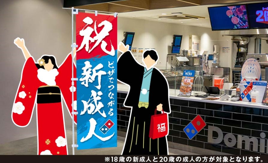 さらに、全国のドミノ・ピザ各店舗に「祝・新成人 ピザでつながる」と書かれた「成人の日特製お祝いのぼり」をご用意し、ご来店いただいた新成人をお祝いいたします。ぜひ、ご家族やご友人とピザを片手に特製のぼりと記念写真を撮影し、「#ドミノピザ」をつけてSNS(X)への投稿をお願いします。
