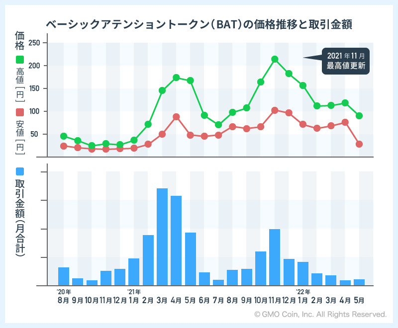 暗号資産取引のGMOコイン:ベーシックアテンショントークン(BAT)の価格推移と取引金額をご紹介(販売所)