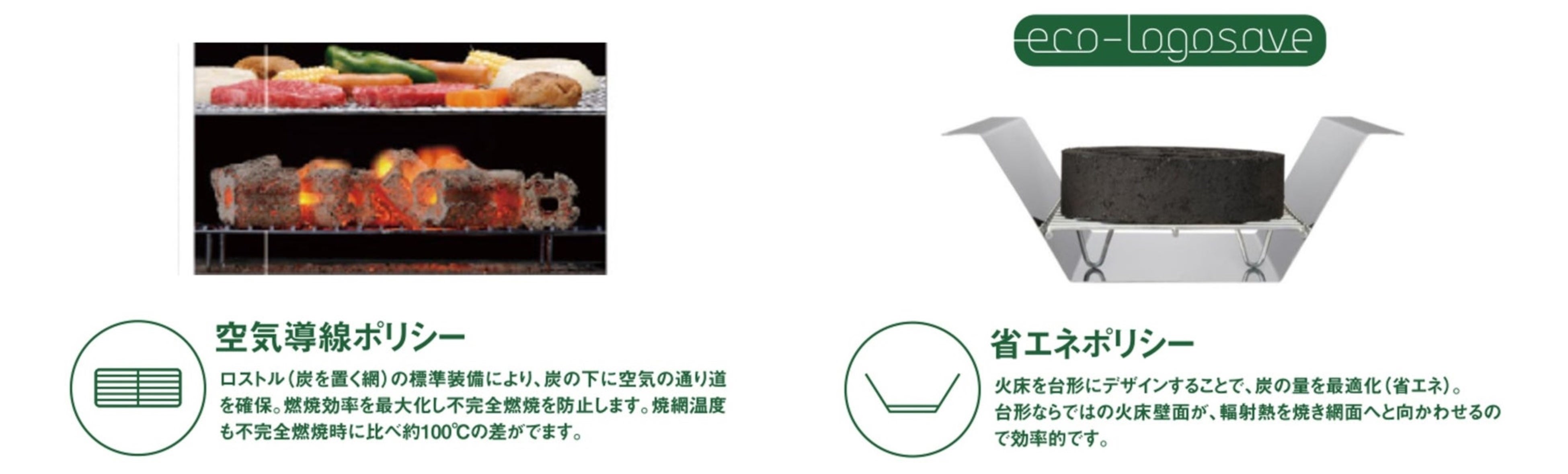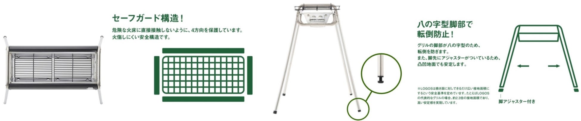 また、本アイテムはBBQをより美味しく安全に楽しむためのLOGOSのこだわりとしてエコロゴセーブ機能を採用しています。ロストル(炭を置く網)を標準装備し、空気の循環をスムーズにすることで不完全燃焼を防止するほか、台形にデザインされた火床により炭の量を最適化します。さらに、火床に直接接触しないように本体の4方向を保護しているため、火傷のリスクが低く安心です。脚部はグリルの転倒を防げる八の字型で、脚先にはアジャスターが付いているので、凸凹地面でも安定して調理できます。