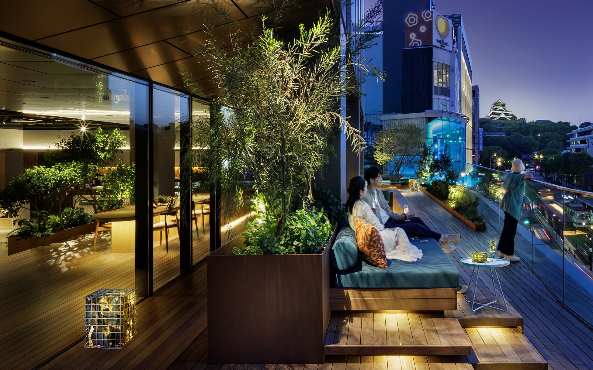 OMO5熊本の一番の特徴は、熊本城を望む「凸凹テラス」です。夜の「凸凹テラス」では、熊本城のライトアップに合わせて明かりが灯り、お城と呼応する建築デザインがより一層際立ちます。私たちはこの空間を生かし、熊本らしさを感じられる体験をしてほしいと考え、この街のシンボルである熊本城を主役に掲げました。お客様には熊本城をテーマに、ご近所さんの「むしゃんよか」な活動や、清正公さんと繋がる歴史に触れ、夜風に当たりながら街の賑わいを満喫してほしいと考えています。