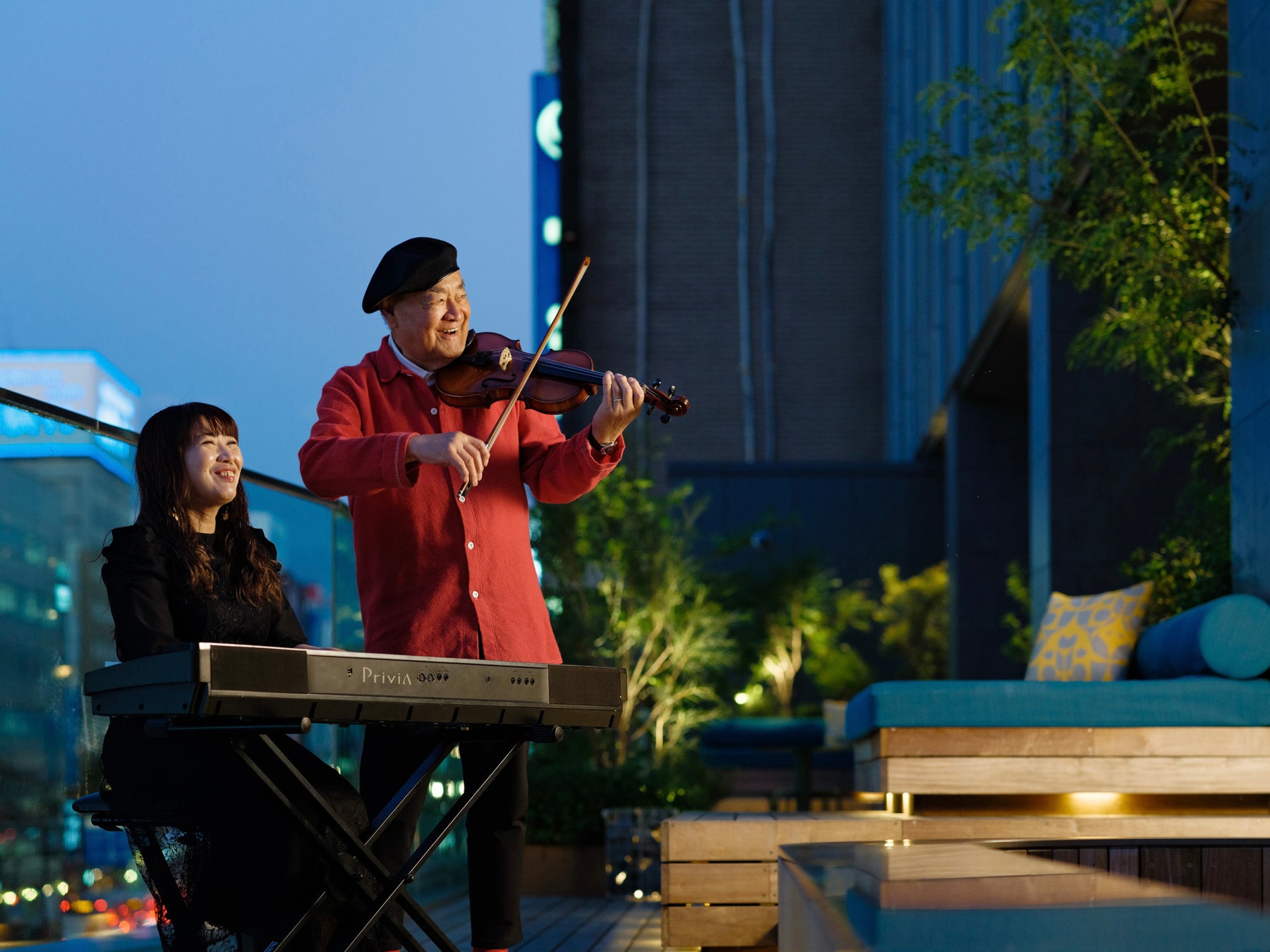 毎週末にはご近所のジャズバイオリニスト、サン村田さんによる「凸凹テラス」での生演奏が開催されます。その日によって変化する熊本城のライトアップや、音楽に耳を傾けたりと、思い思いの時間を過ごすことができます。また、夜限定で「OMOベース」で流す映像は、ご近所で映像制作を行うタクマジャンルーカさんと、作曲家の鎌田優紀子さんにご協力をいただき制作をしました。鳥のさえずりや波音などの自然音とピアノを紡いだ音楽は、夜の「OMOベース」を癒しの空間へと誘います。そしてオリジナルの映像は、OMO5熊本が位置する通町筋の交差点や、街中の様々な角度から望む勇壮な熊本城をはじめ、阿蘇の山々から有明海へと豊かな水が流れる自然の風景などを綴りました。熊本の方にとっては地域の魅力の再発見に、そして旅行のお客様は、街中に滞在しながらも、熊本の大自然を身近に感じることで、新たな熊本の魅力に触れられます。