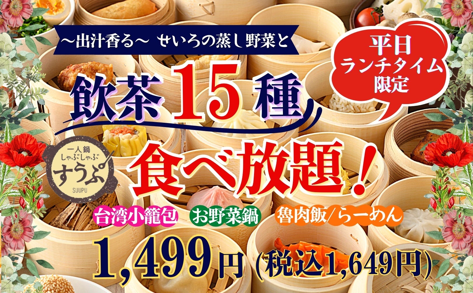 食べ放題のテーマパーク、 ニラックス株式会社(本社:東京都武蔵野市、 代表取締役:崎田 晴義)が運営する「一人鍋しゃぶしゃぶ すうぷ 静岡パルコ店』にて、せいろの蒸し野菜と15種の飲茶が楽しめる『飲茶食べ放題』コースが平日ランチ限定にて新登場!