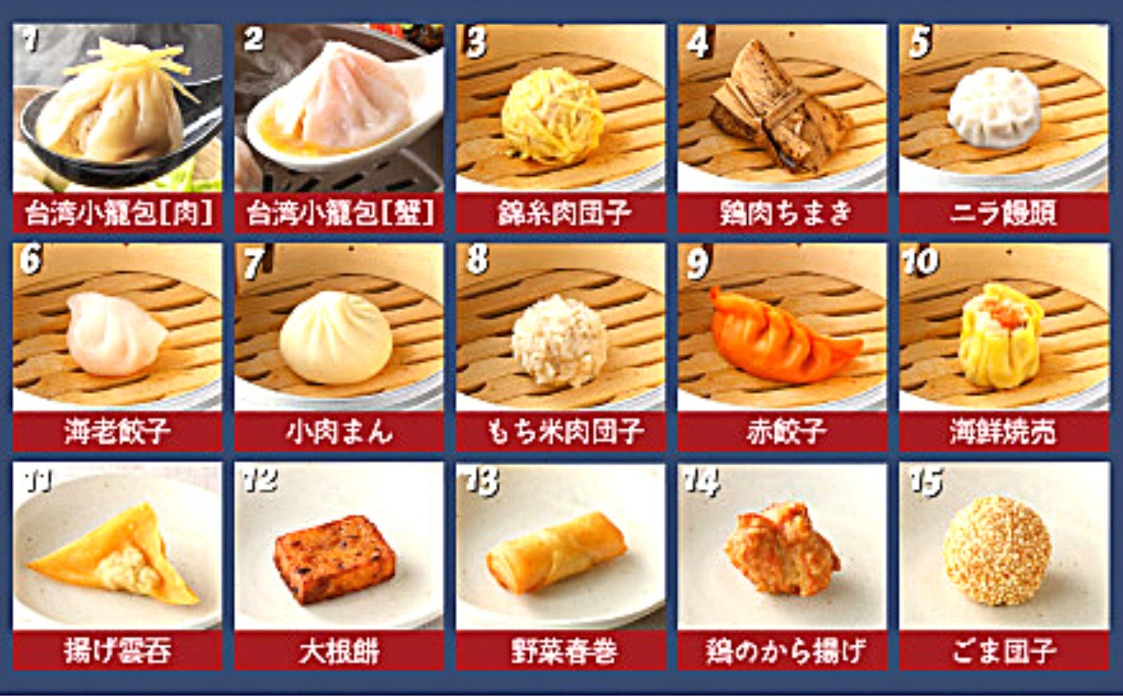 15種の『飲茶』は、肉汁たっぷり!熱々の『台湾小籠包』や、蟹の旨みがギュッと凝縮された『蟹小籠包』、もち米をまとい、ふっくらもちもち食感の『もち米肉団子』や、唐辛子の辛味と花椒のすっきり味がビールとの相性抜群な『赤餃子』など、定番人気のラインナップが勢ぞろい!