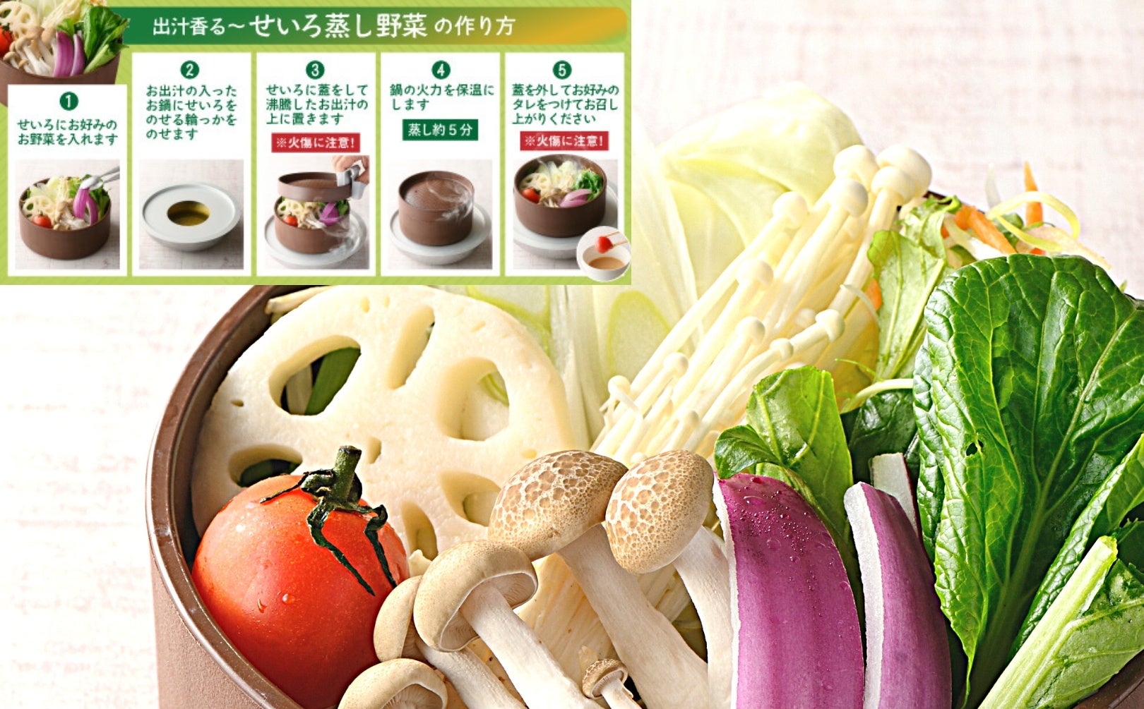 そして、風味豊かな優しい黄金出汁で蒸しあげる『せいろの蒸し野菜』は、旬の青菜や、蓮根、きのこなど『お野菜バー』からお好きなお野菜を選んでいただくスタイル。