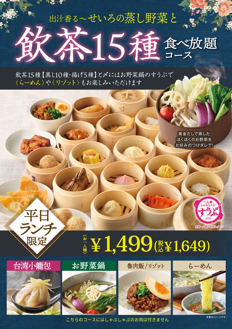 ●出汁香る~ せいろの蒸し野菜と飲茶15種食べ放題コース 1499円(税込1,649円)