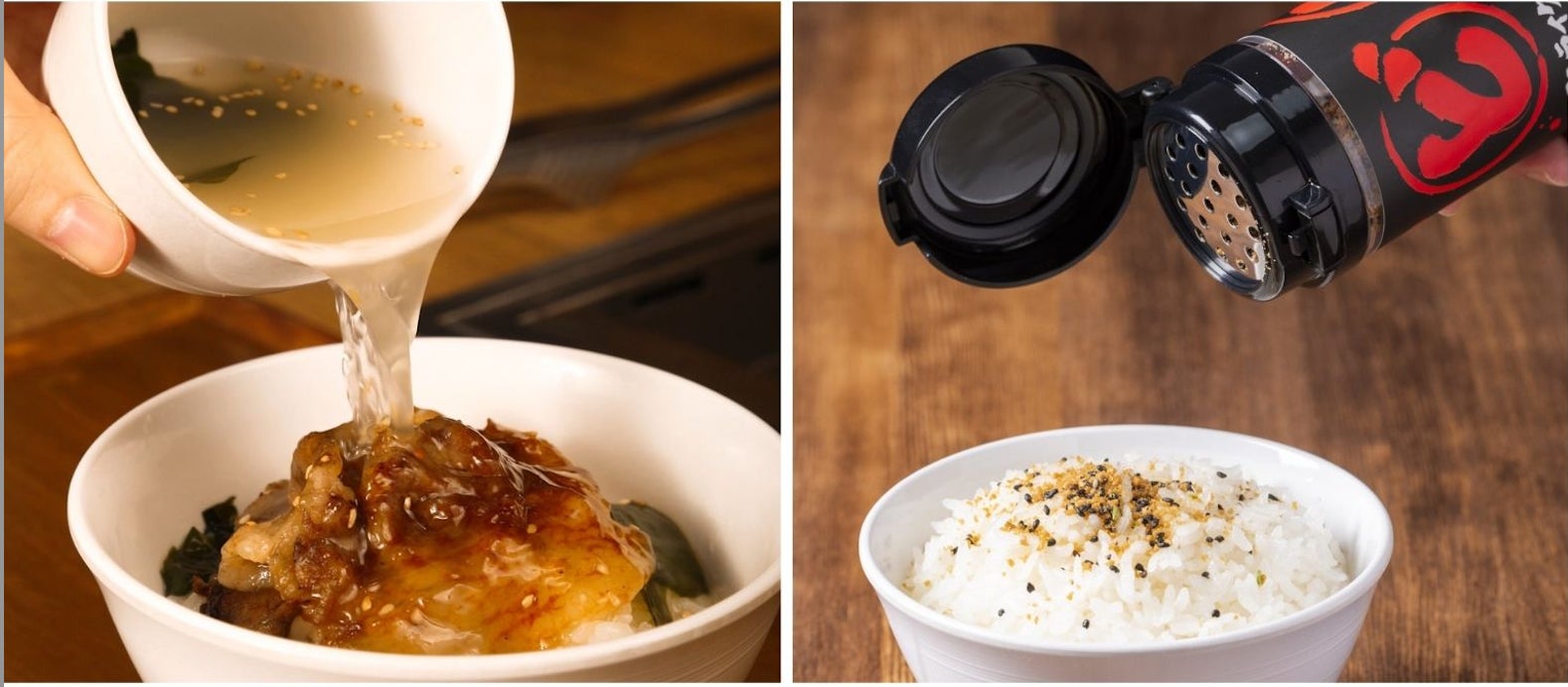牛骨スープやユッケジャンスープをかけてお茶漬け風にしたり、にんにくベースに10種のスパイスを配合した「ど・ストライクふりかけ」で風味をプラスしたりと、自由なアレンジでごはんをよりおいしく味わえます。