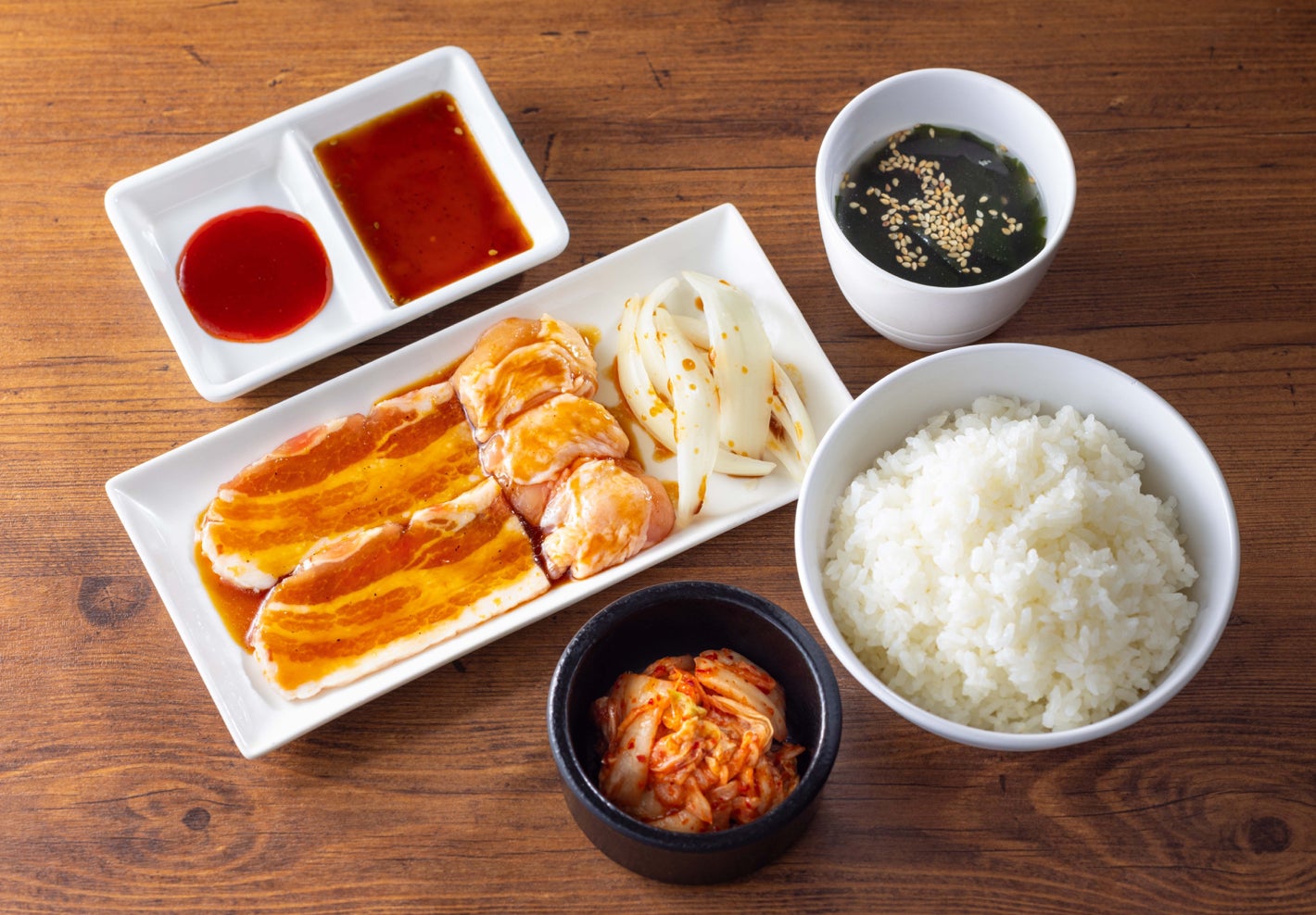 お得な焼肉セットは580円から。「ライクセット(豚カルビ&但馬鶏もも・Sサイズ)」など、手頃な価格で焼肉と“無限ごはん・スープ・キムチ”を楽しめます。