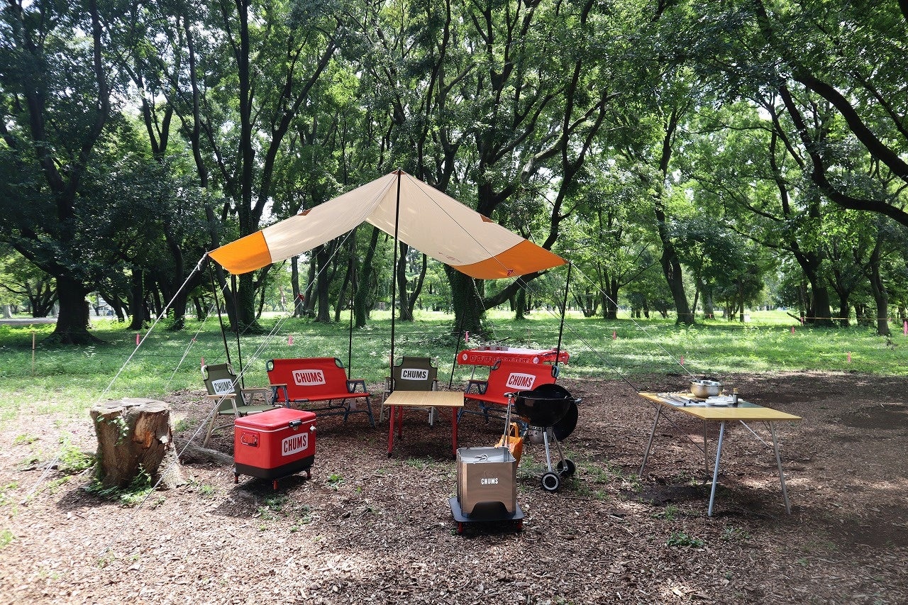 各公園内にあるバーベキューエリアを会場に、秋の景色を楽しみながら、料理を作って、スイーツまでゆっくり召し上がれるのんびりデイキャンプが楽しめます。アウトドアブランド「CHUMS」のテントやイス、グリルや調理器具はセッティング済みなので、気軽にご参加いただけます!