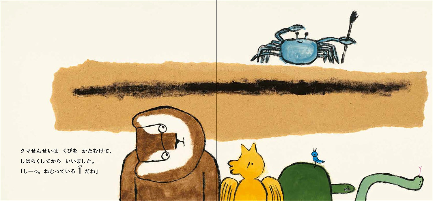 クマせんせいはくびをかたむけて、しばらくしてからいいました。「しーっ。ねむっている1ですね」