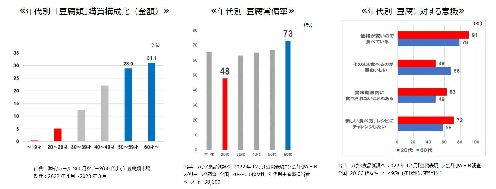 世代別に見ると、現状消費の中心は50~60代で、全体の約6割を占めています。豆腐の常備率も、60代の7割以上に対し、20代は5割以下の水準です。